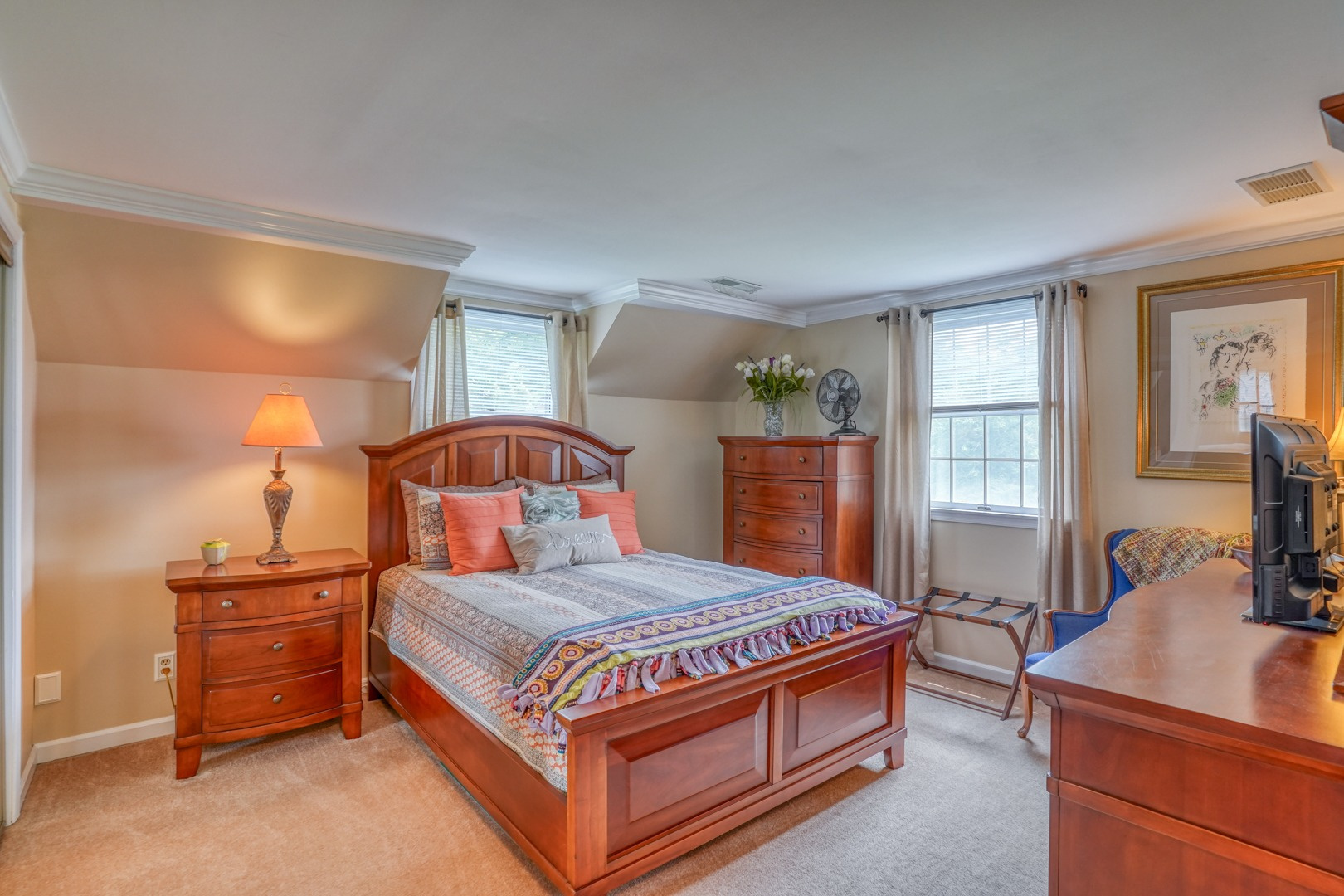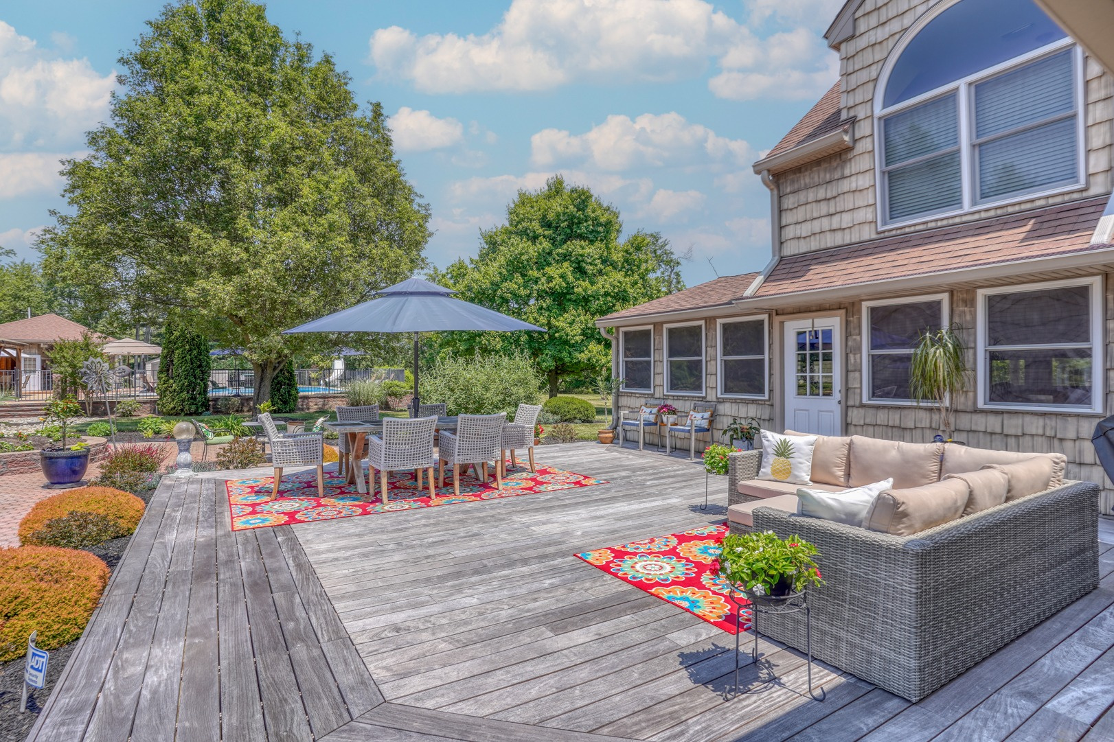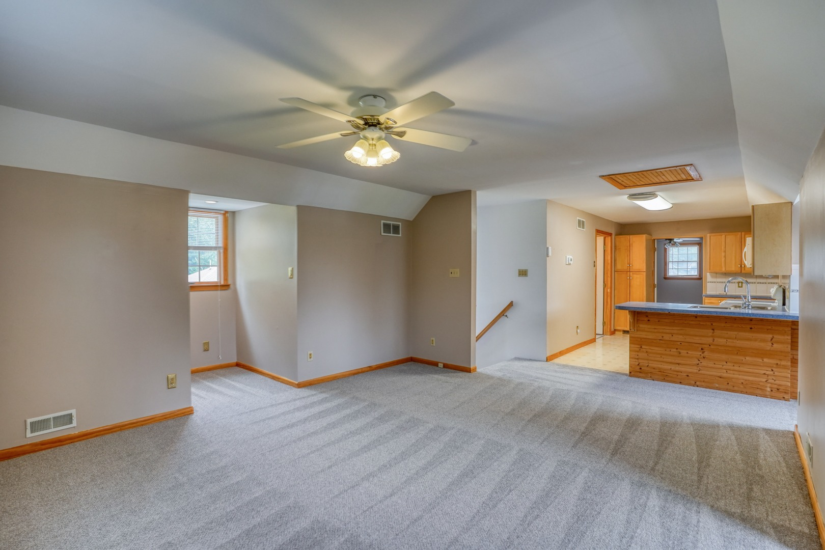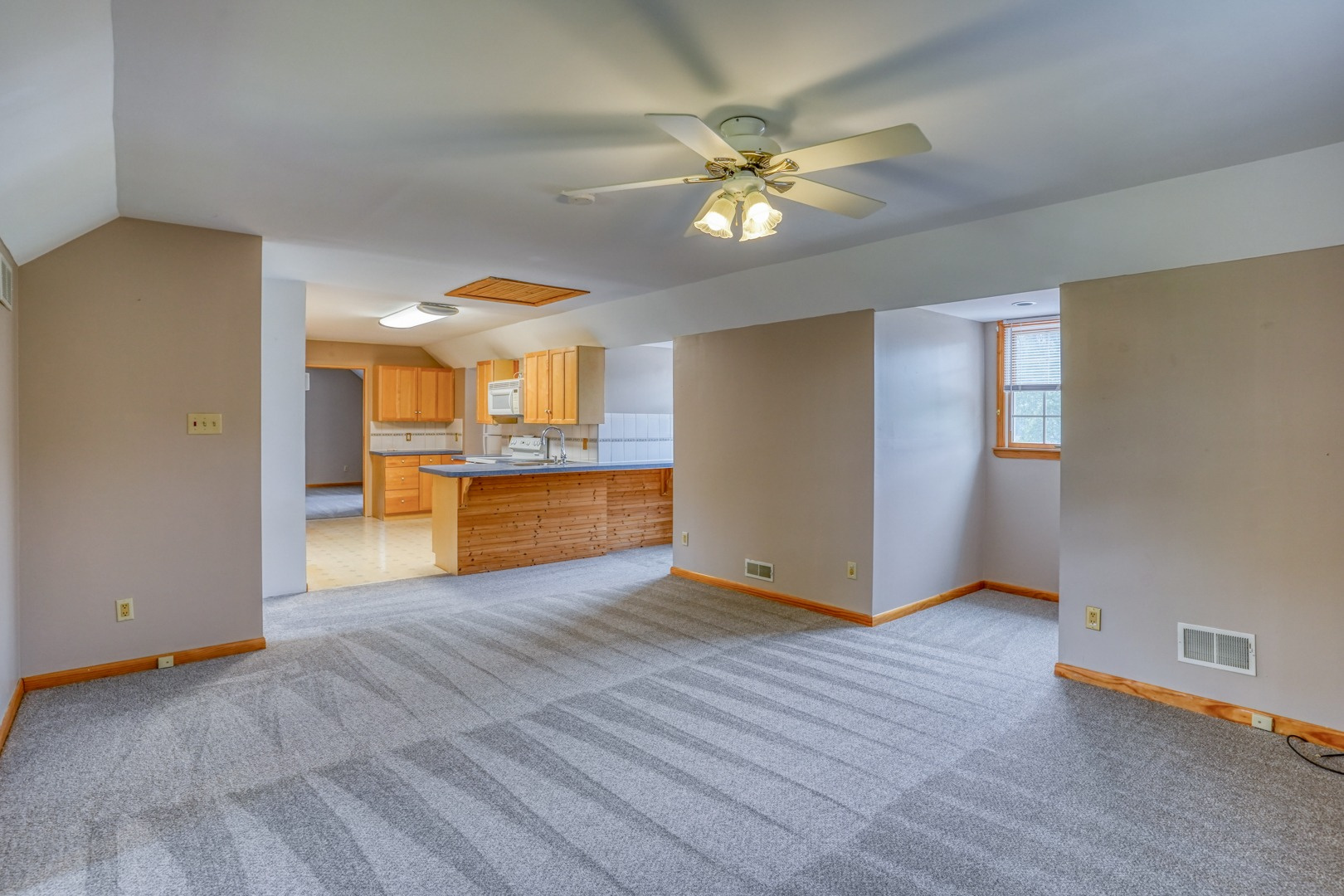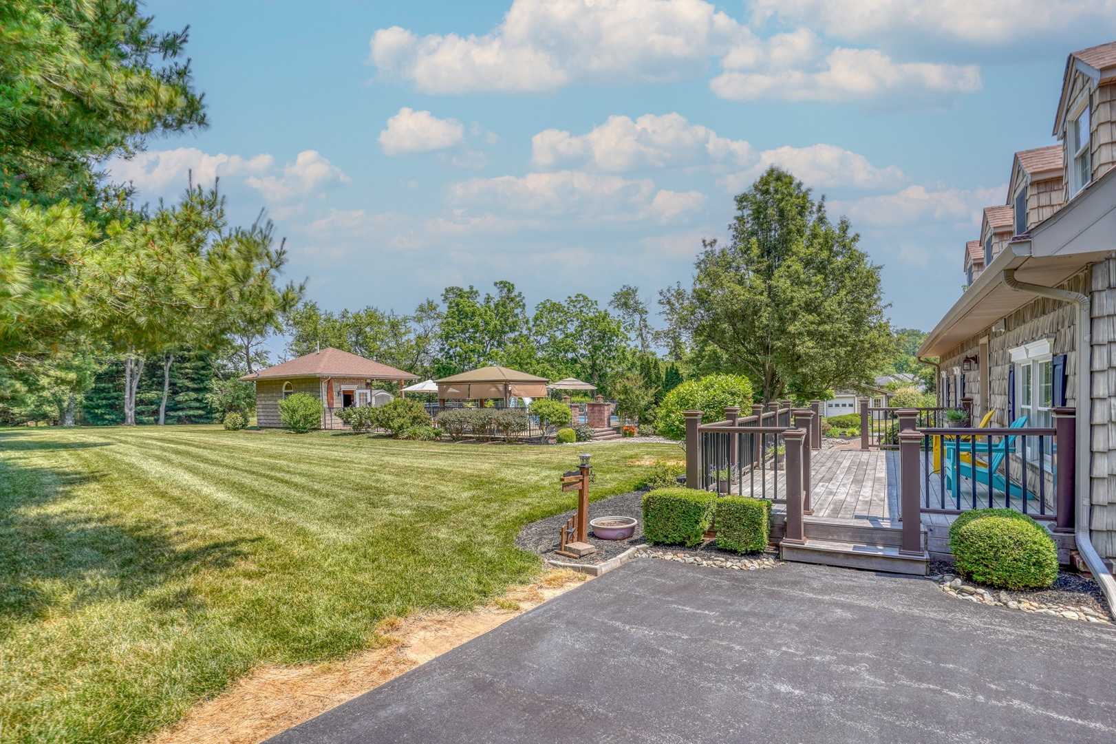 Finally, a guest apartment/in-law suite above the detached garage provides a separate living space with its own entrance, deck, and parking area. This generous apartment offers 1 bedroom, 1 full bathroom, a full kitchen, and a family room. With neutral paint and new carpeting, it is move-in ready and exudes comfort and style.