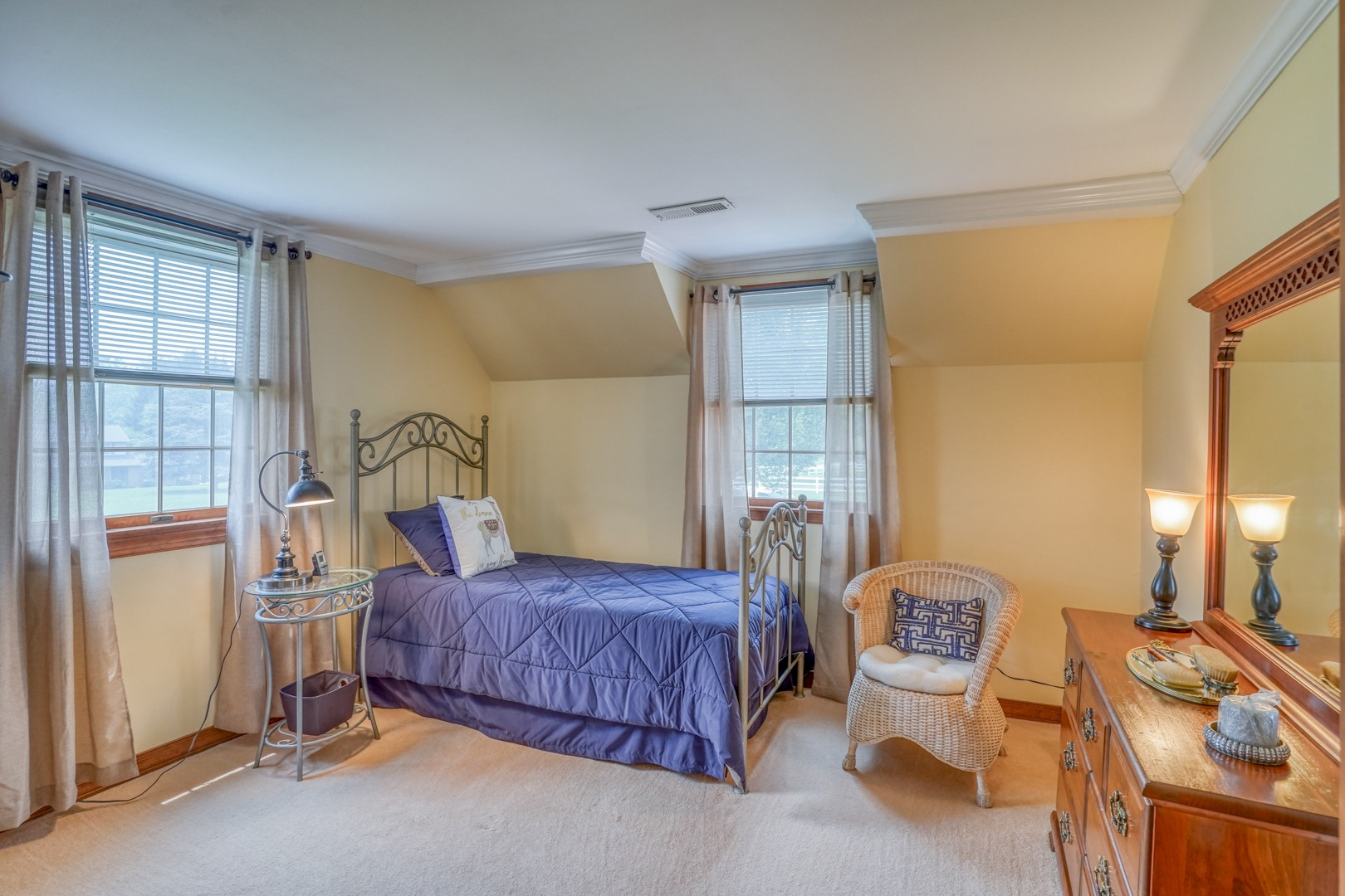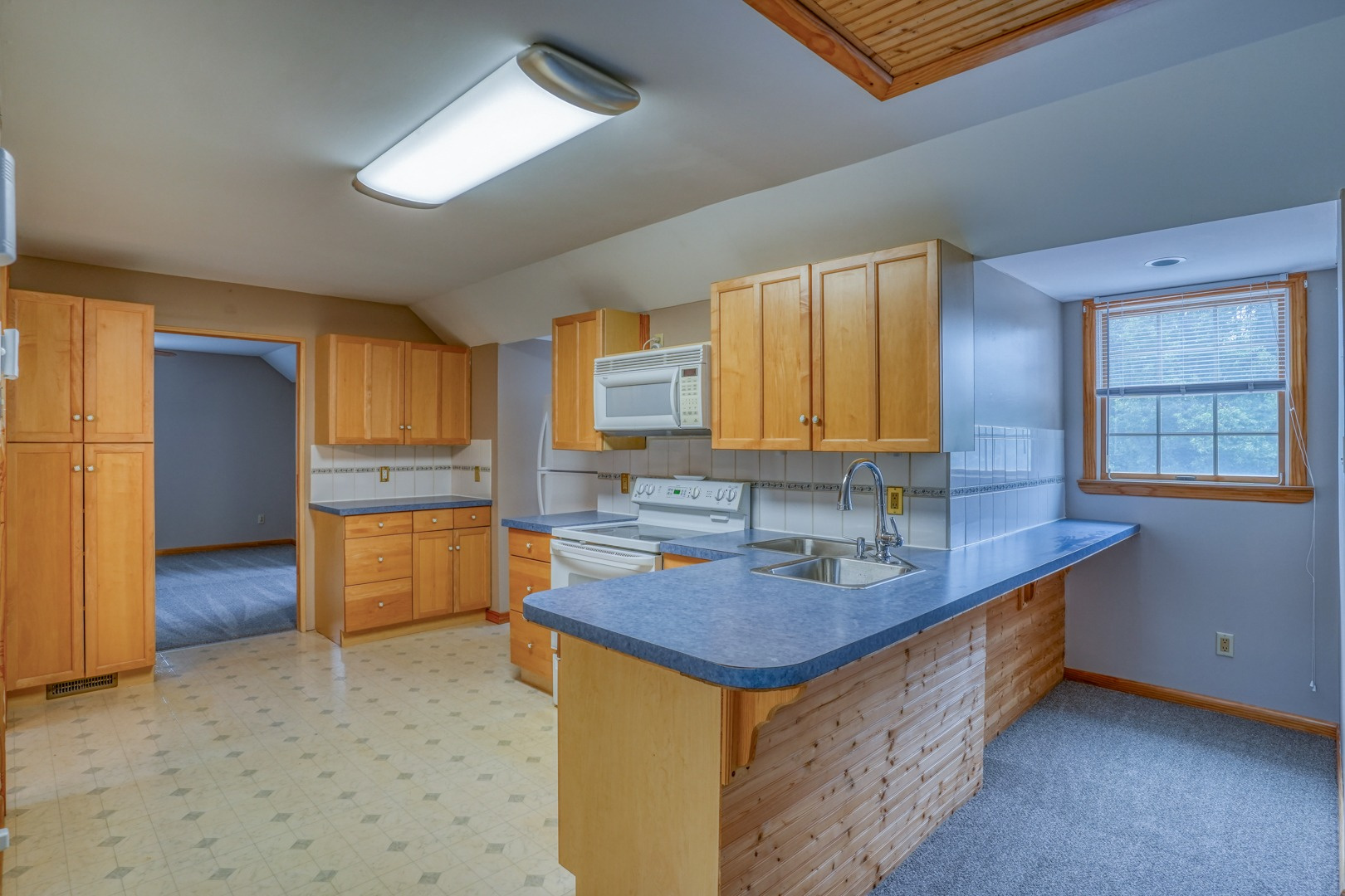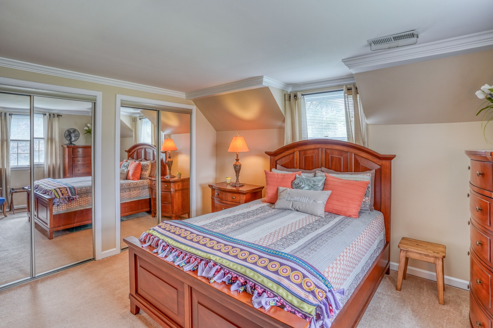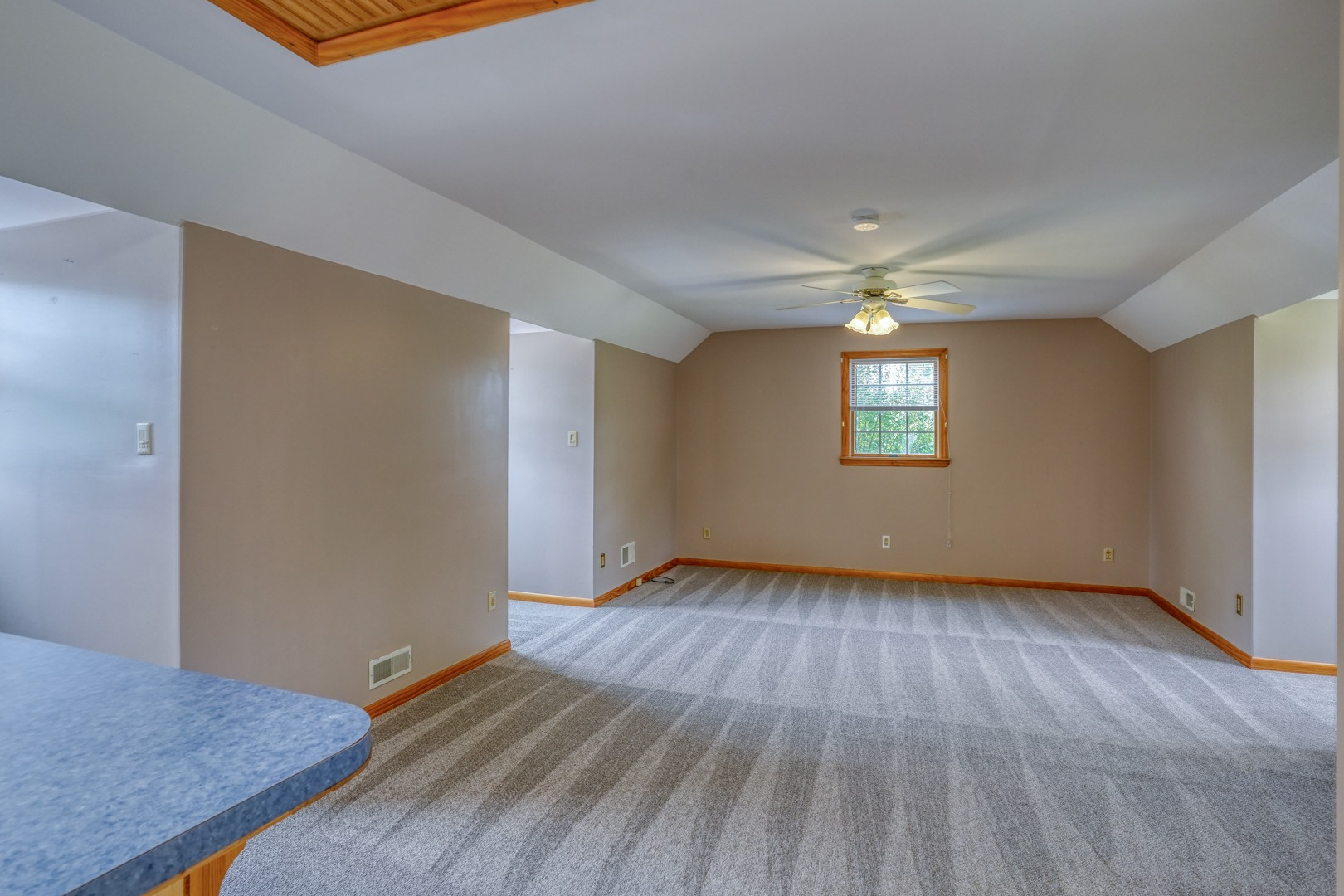 Finally, a guest apartment/in-law suite above the detached garage provides a separate living space with its own entrance, deck, and parking area. This generous apartment offers 1 bedroom, 1 full bathroom, a full kitchen, and a family room. With neutral paint and new carpeting, it is move-in ready and exudes comfort and style.