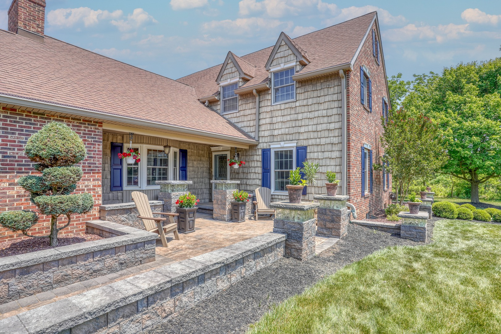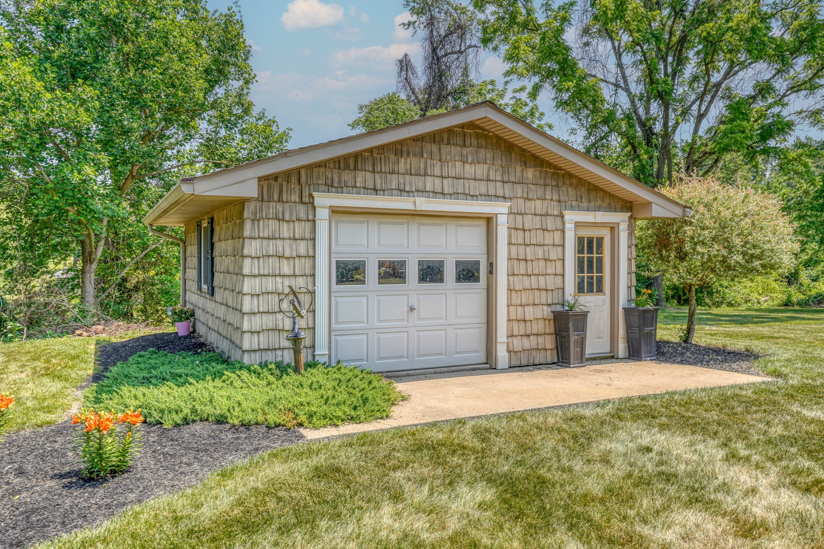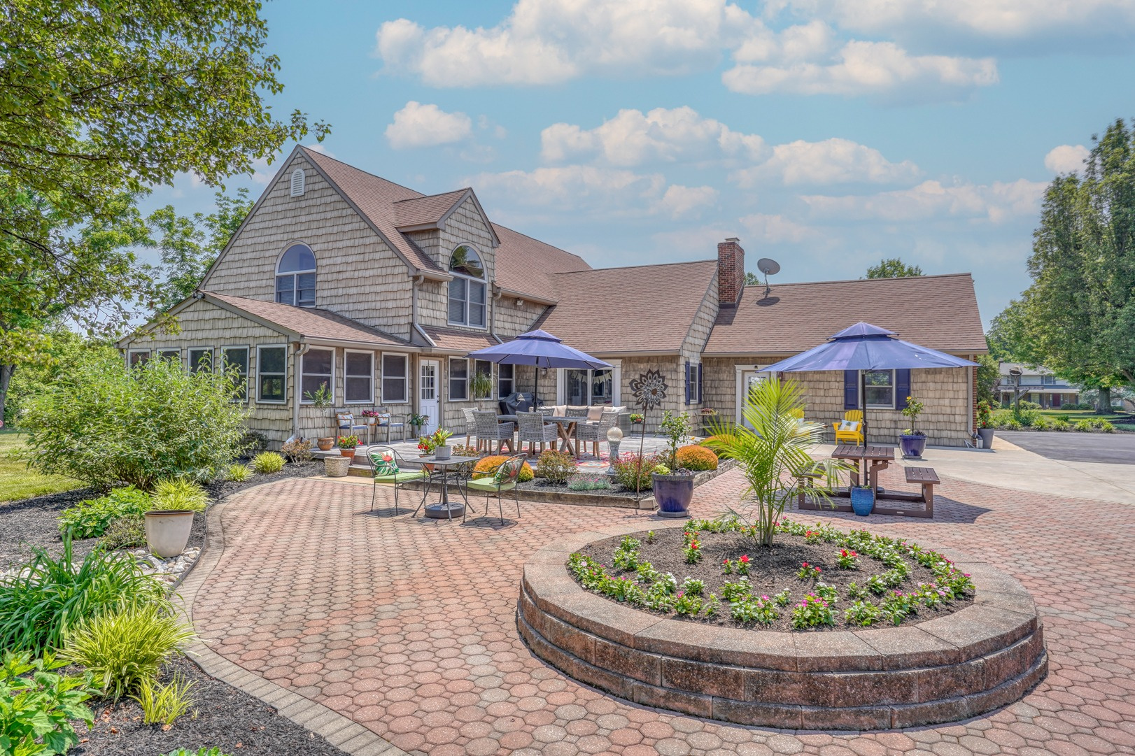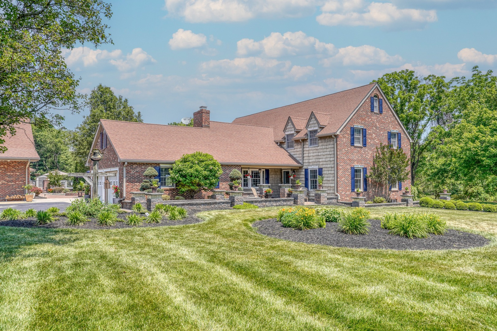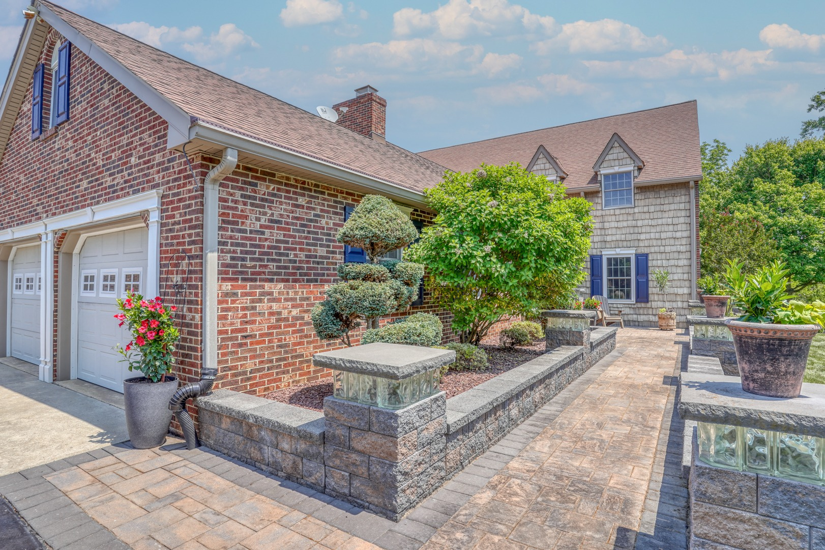 Nestled amidst mature landscaping throughout the property, this home truly embodies paradise. Take pleasure in observing the local wildlife, from enchanting birds to the occasional graceful deer, as you savor your morning coffee. As you arrive for your showing, the pride of ownership is evident from the meticulously manicured lawn to the custom paver walkway leading you to the welcoming covered front porch. Illuminated by elegant paver walls and pillars with gentle lighting, the brick front of the main home and detached garage are complemented by high-end vinyl shake siding, exuding timeless sophistication.