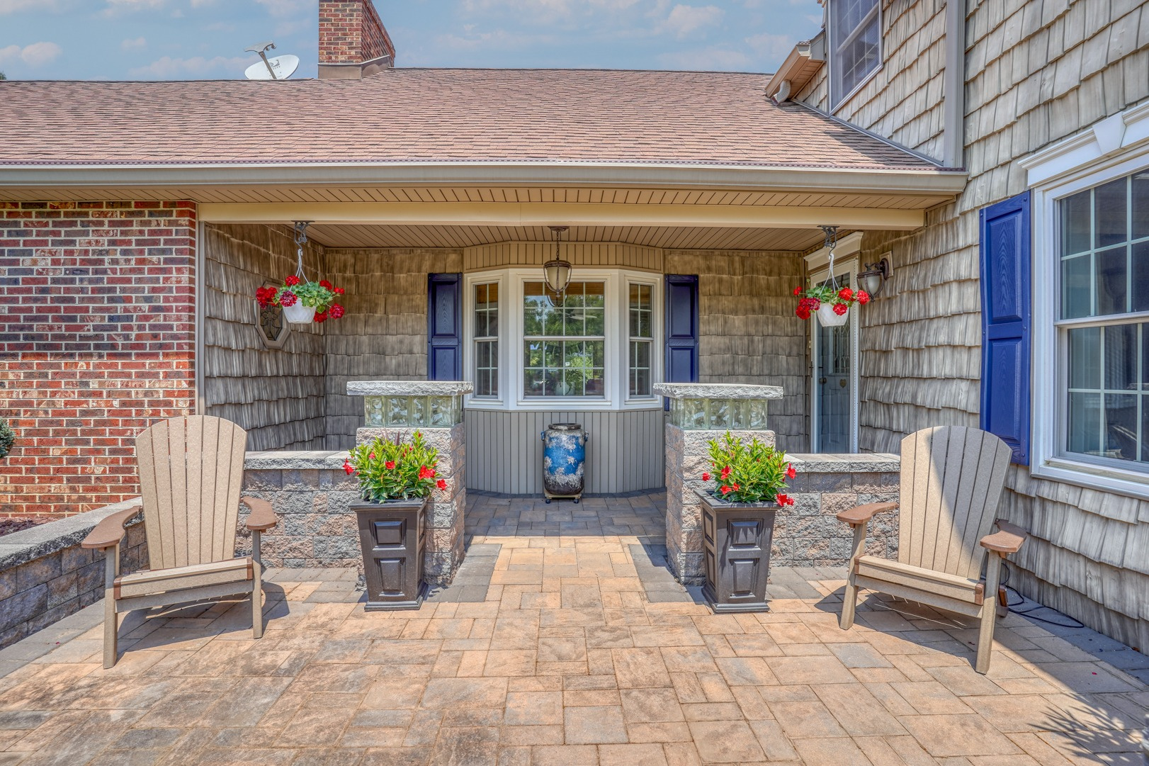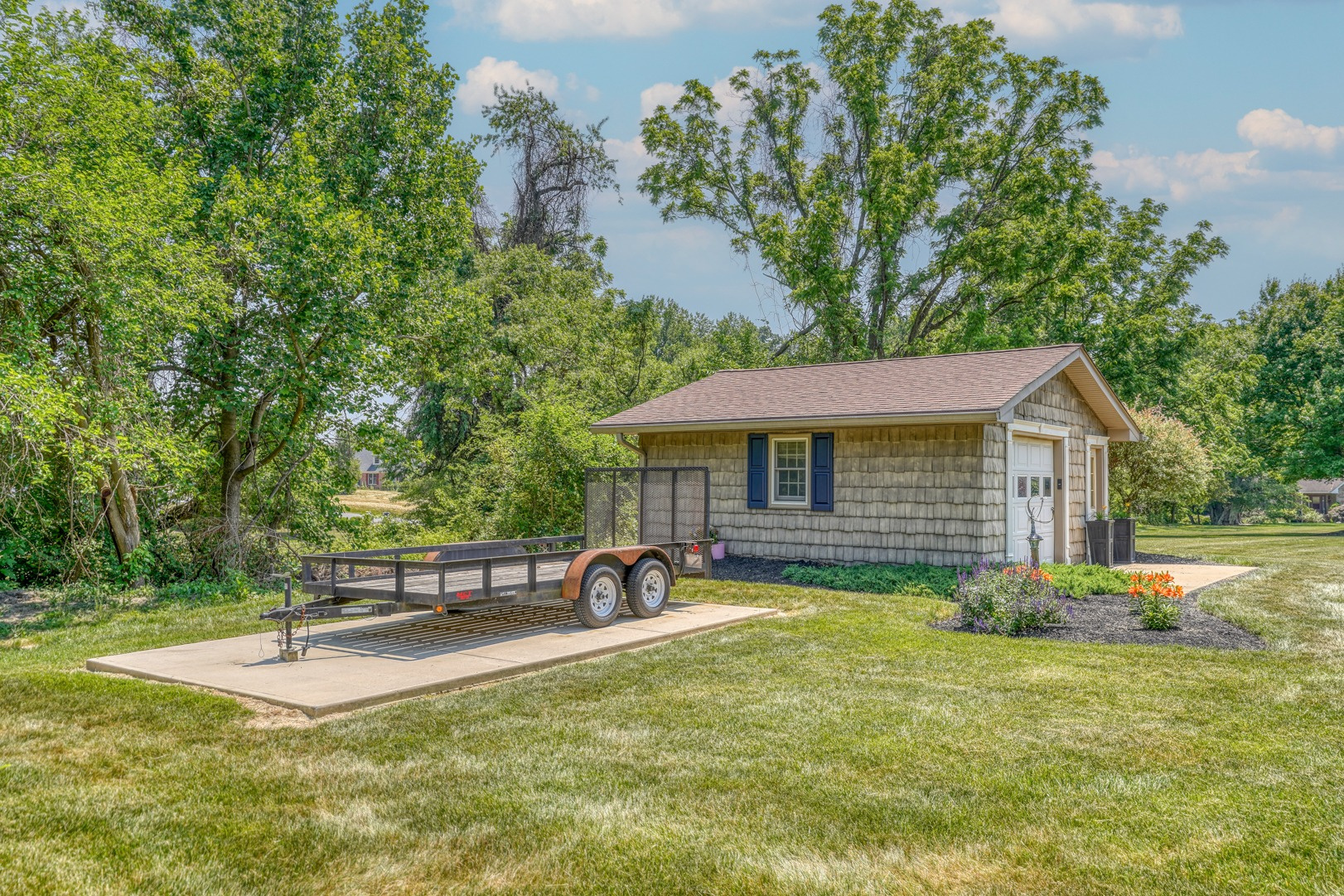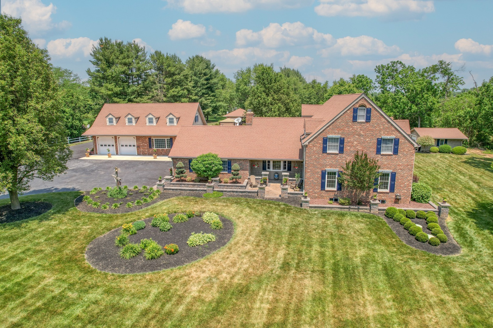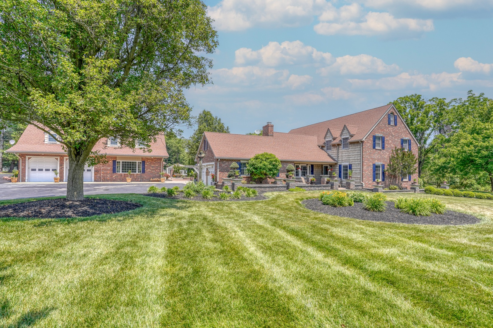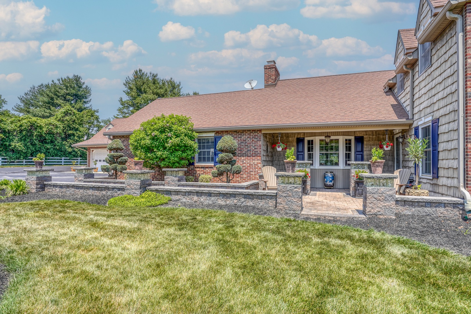Nestled amidst mature landscaping throughout the property, this home truly embodies paradise. Take pleasure in observing the local wildlife, from enchanting birds to the occasional graceful deer, as you savor your morning coffee. As you arrive for your showing, the pride of ownership is evident from the meticulously manicured lawn to the custom paver walkway leading you to the welcoming covered front porch. Illuminated by elegant paver walls and pillars with gentle lighting, the brick front of the main home and detached garage are complemented by high-end vinyl shake siding, exuding timeless sophistication.