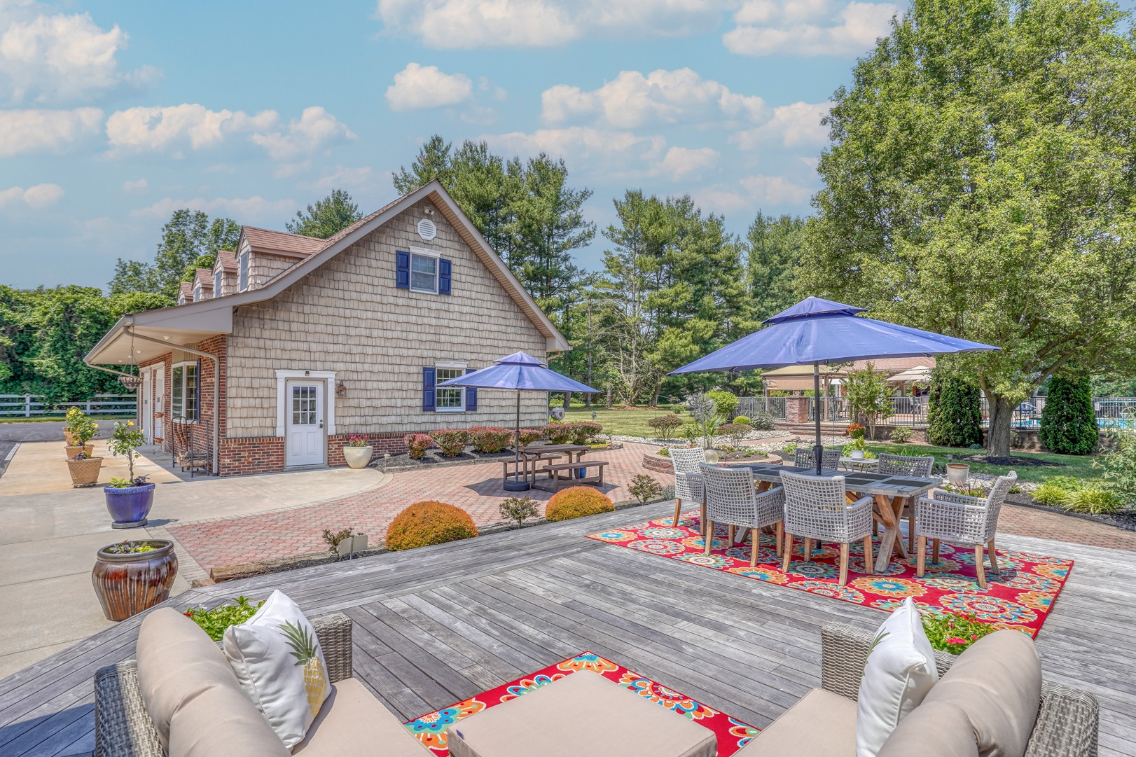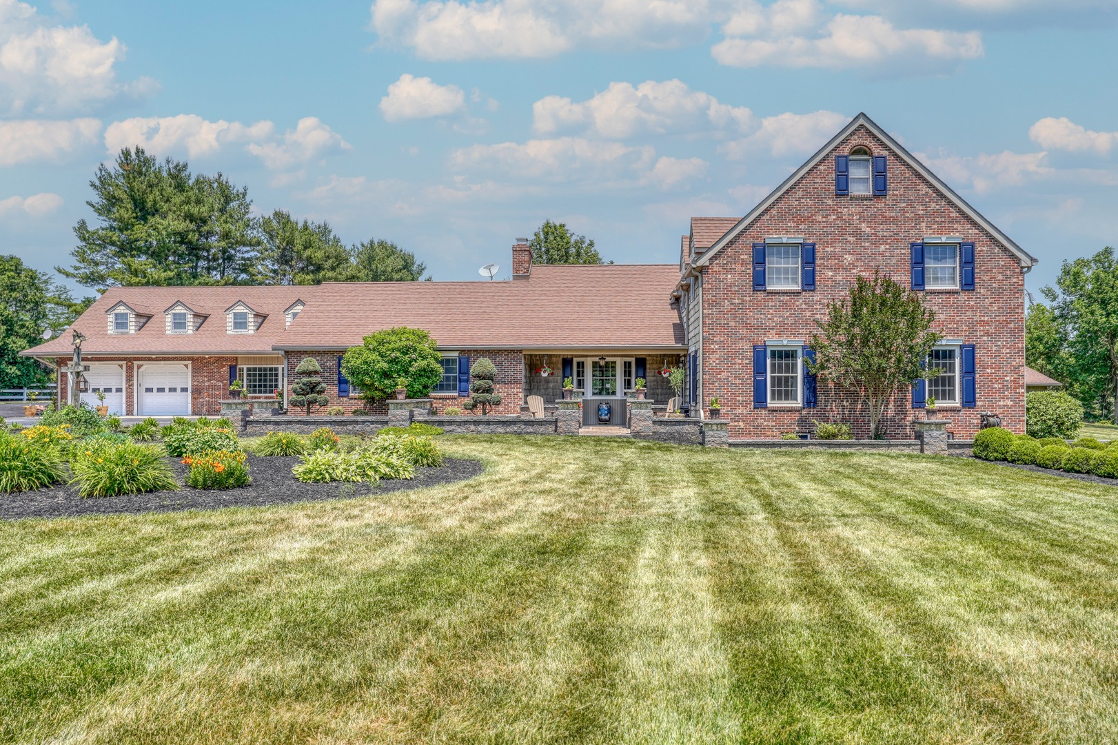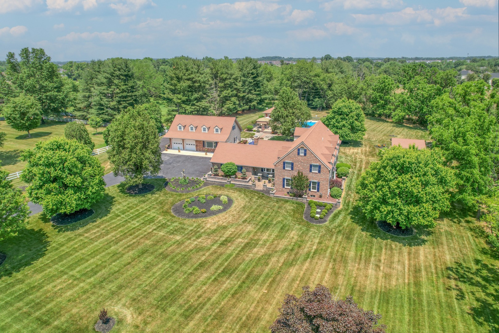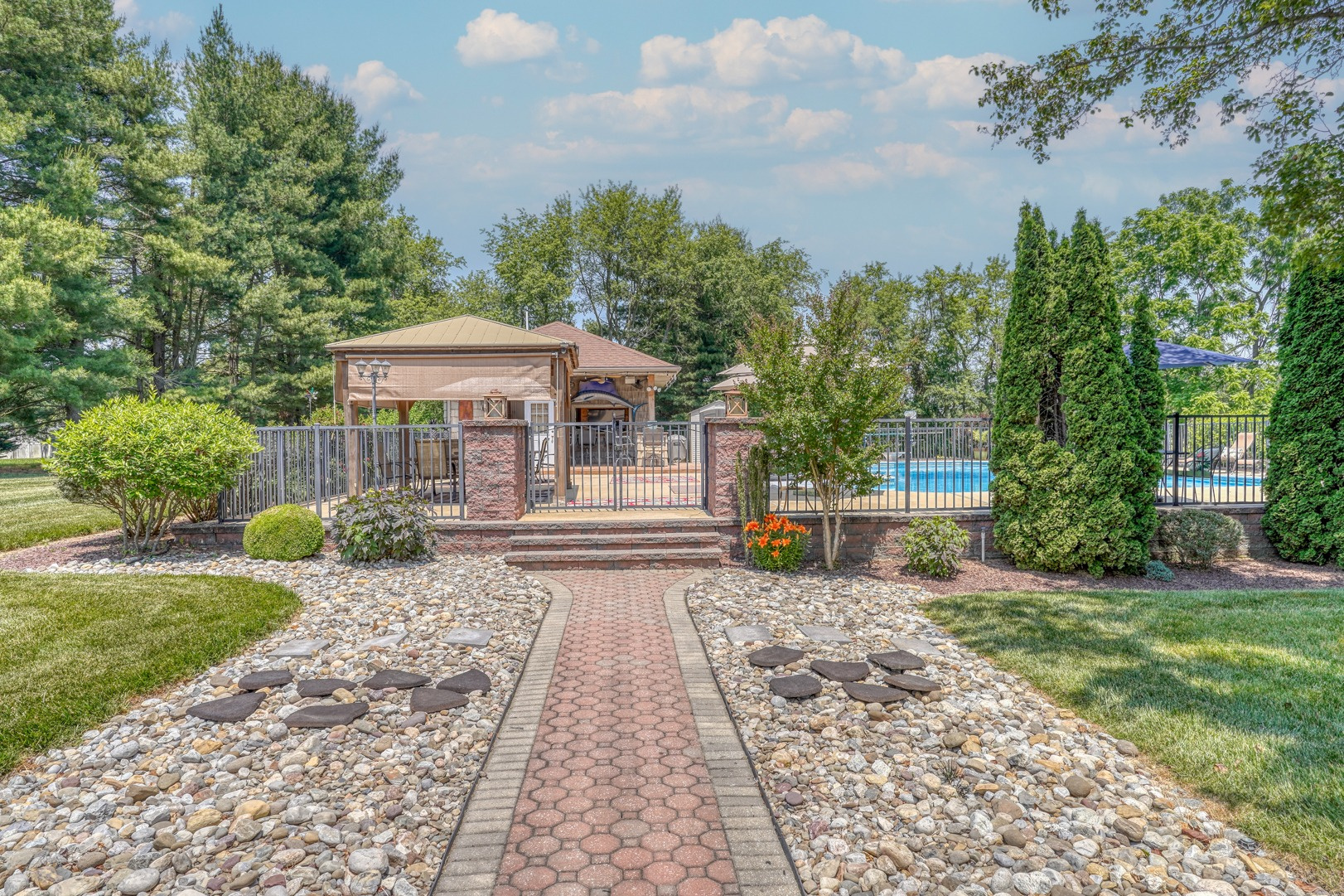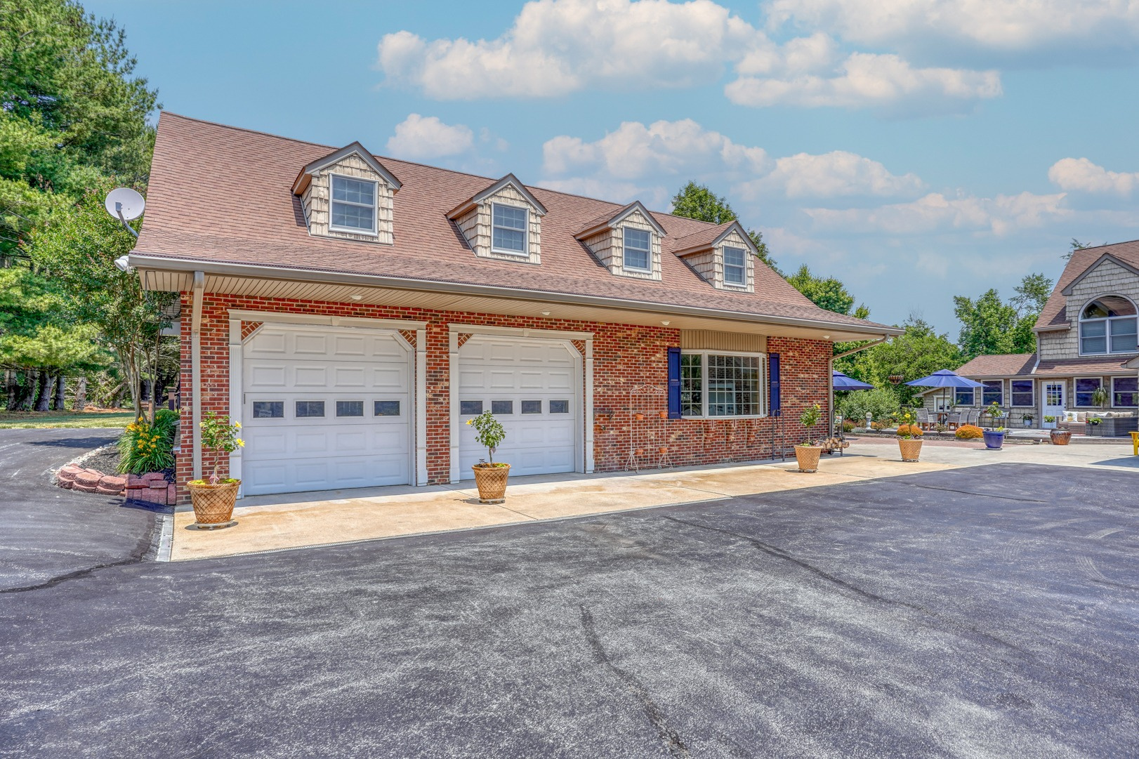Nestled amidst mature landscaping throughout the property, this home truly embodies paradise. Take pleasure in observing the local wildlife, from enchanting birds to the occasional graceful deer, as you savor your morning coffee. As you arrive for your showing, the pride of ownership is evident from the meticulously manicured lawn to the custom paver walkway leading you to the welcoming covered front porch. Illuminated by elegant paver walls and pillars with gentle lighting, the brick front of the main home and detached garage are complemented by high-end vinyl shake siding, exuding timeless sophistication.