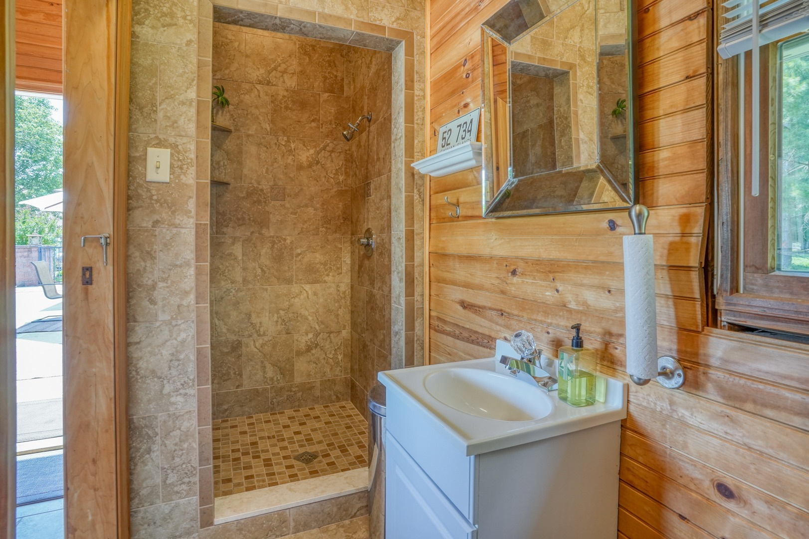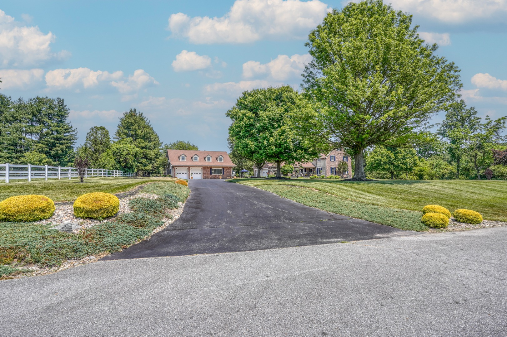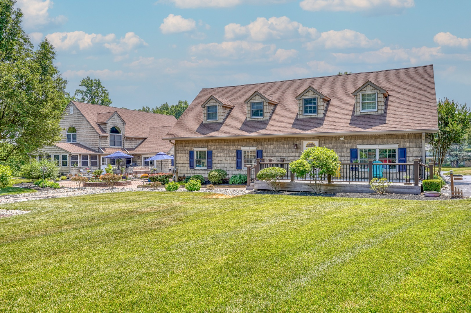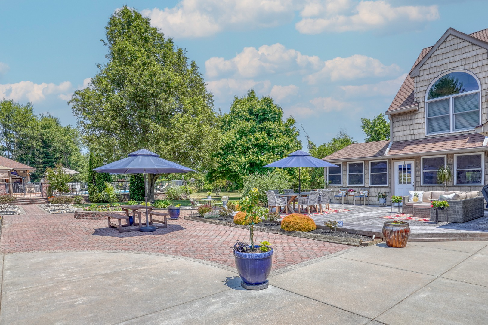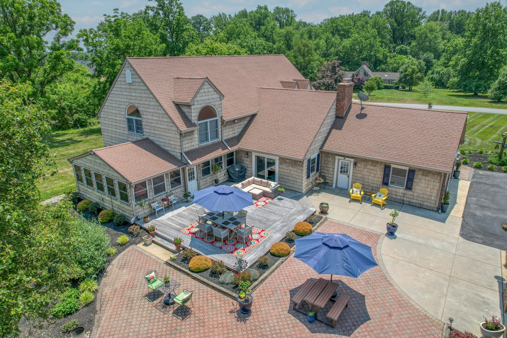 Nestled amidst mature landscaping throughout the property, this home truly embodies paradise. Take pleasure in observing the local wildlife, from enchanting birds to the occasional graceful deer, as you savor your morning coffee. As you arrive for your showing, the pride of ownership is evident from the meticulously manicured lawn to the custom paver walkway leading you to the welcoming covered front porch. Illuminated by elegant paver walls and pillars with gentle lighting, the brick front of the main home and detached garage are complemented by high-end vinyl shake siding, exuding timeless sophistication.
