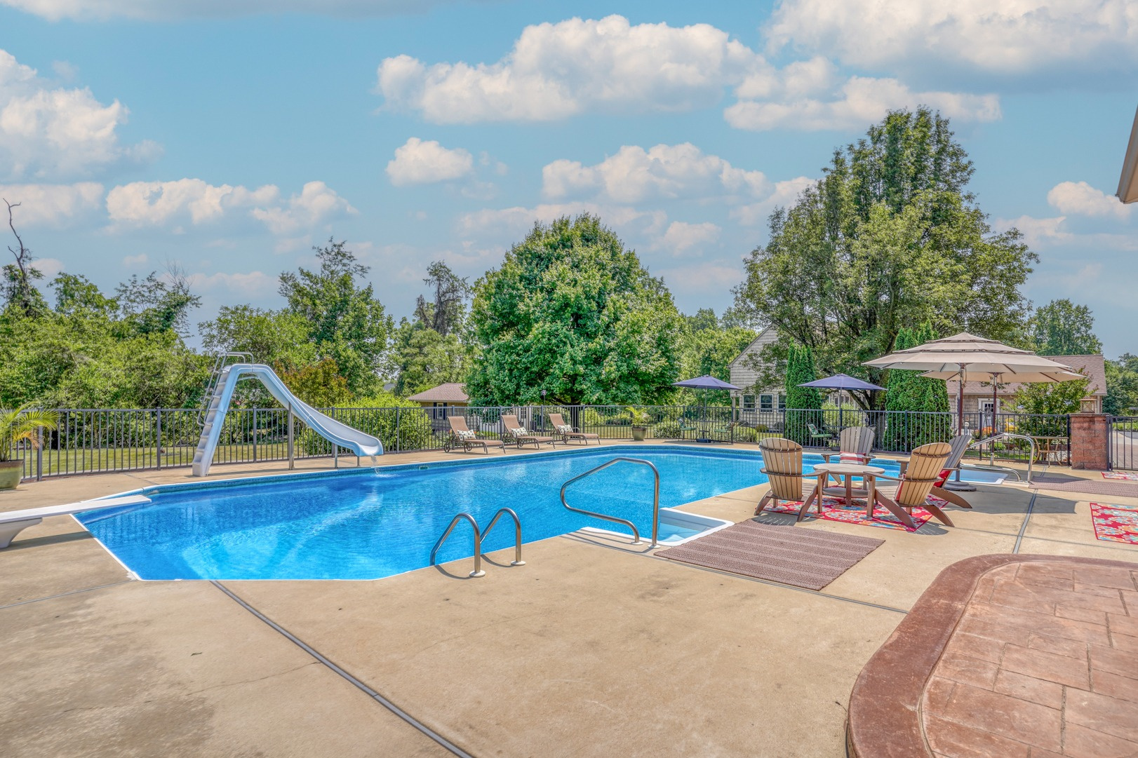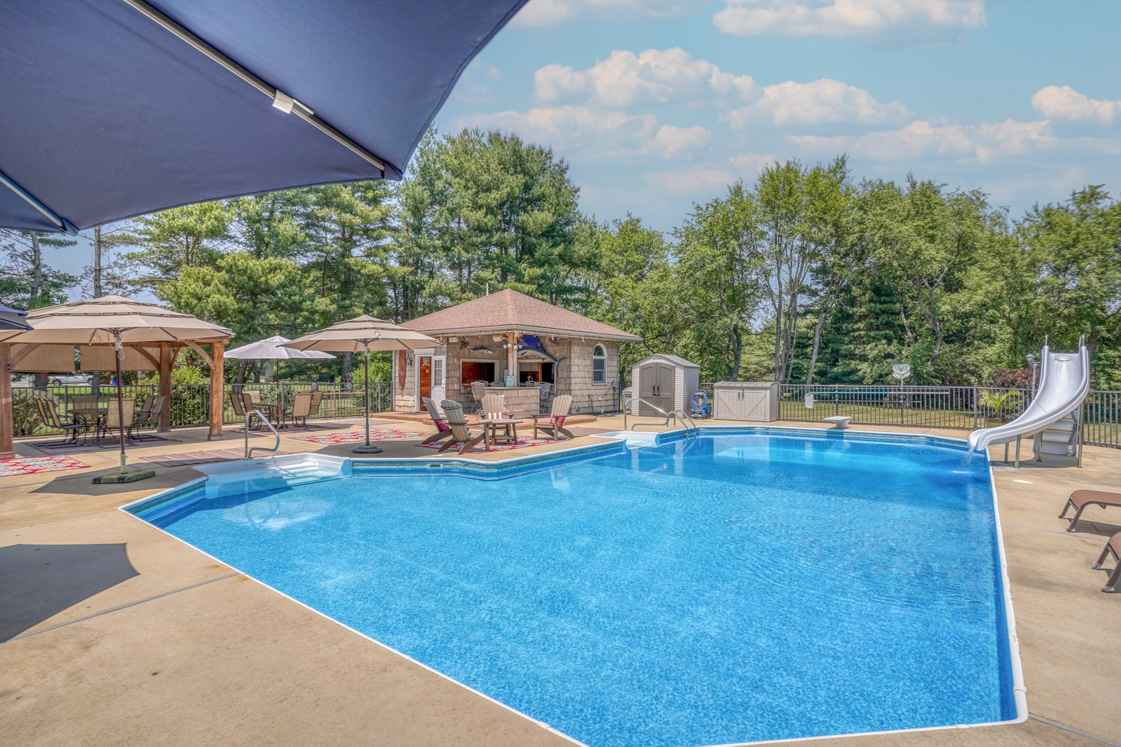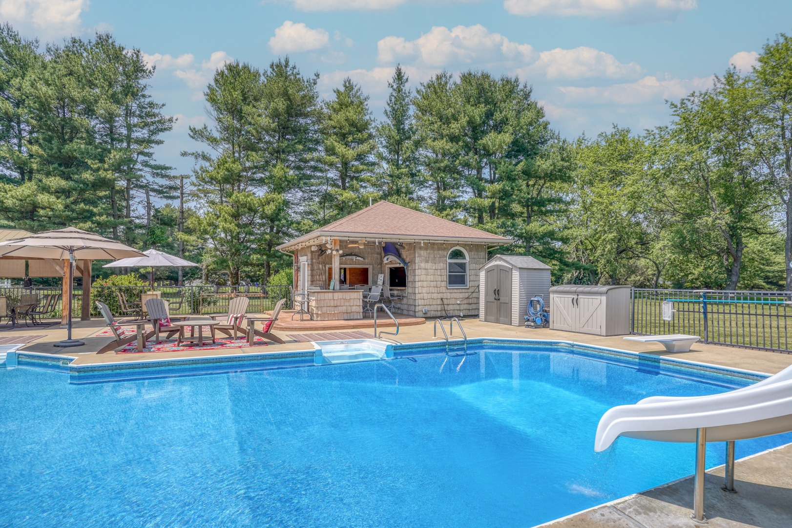 Indulge in the ultimate outdoor retreat with your very own approximately 48,000-gallon saltwater inground pool featuring a diving board, sliding board, and an elevated design that boasts a stunning custom paver wall adorned with pillars and complemented by a sleek black fence. Surrounding the pool, you'll find ample space for lounging and entertaining, while a gazebo with sun-blocking screens provides a shaded oasis for relaxation.