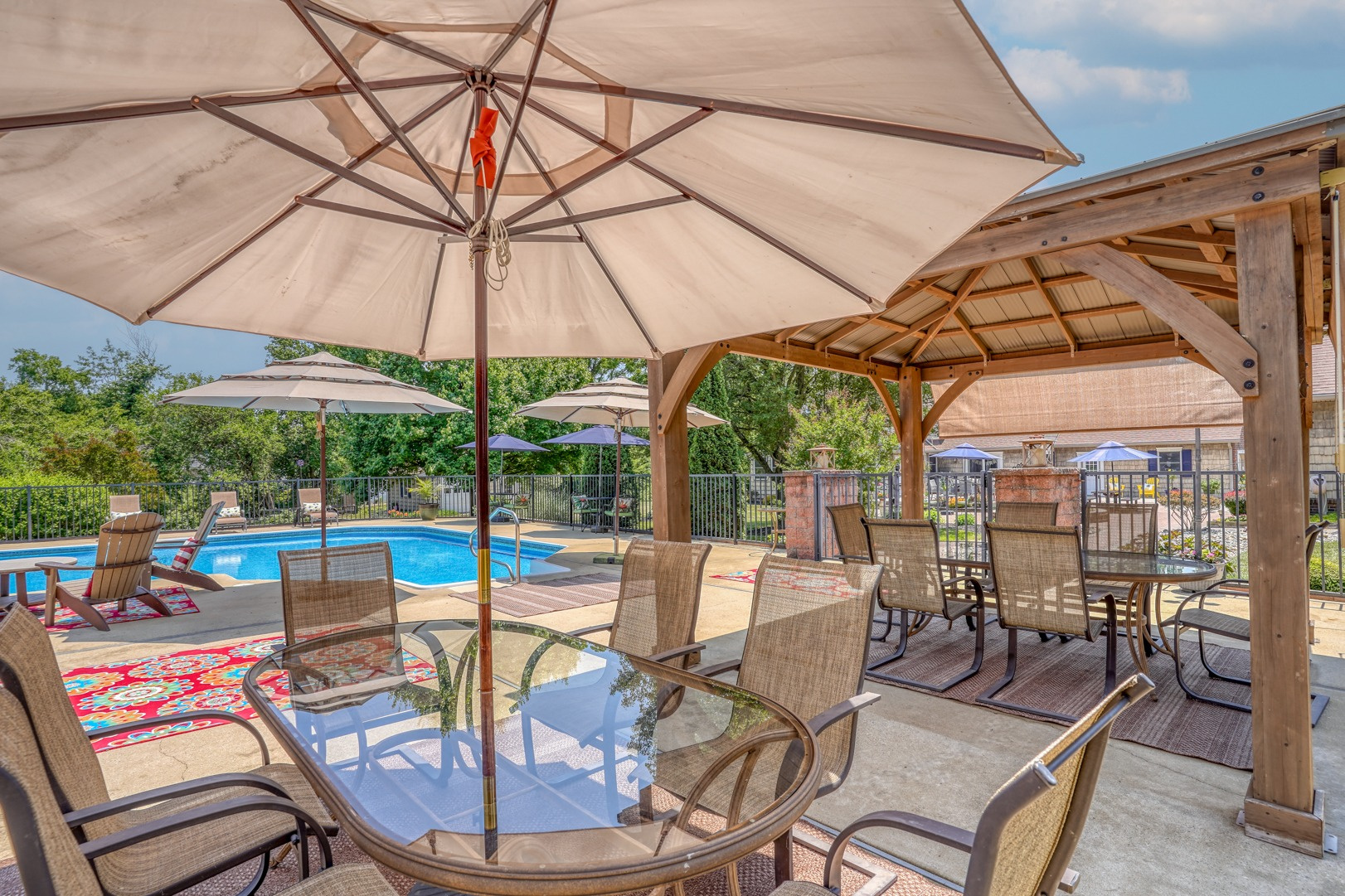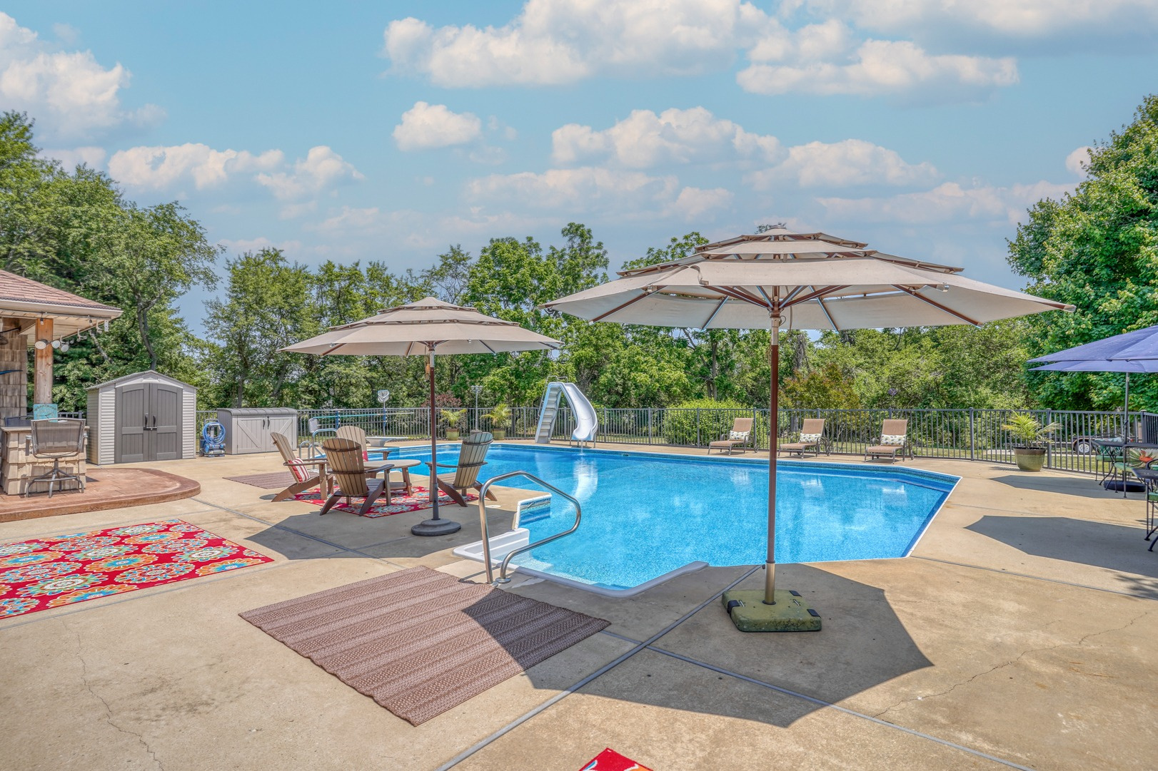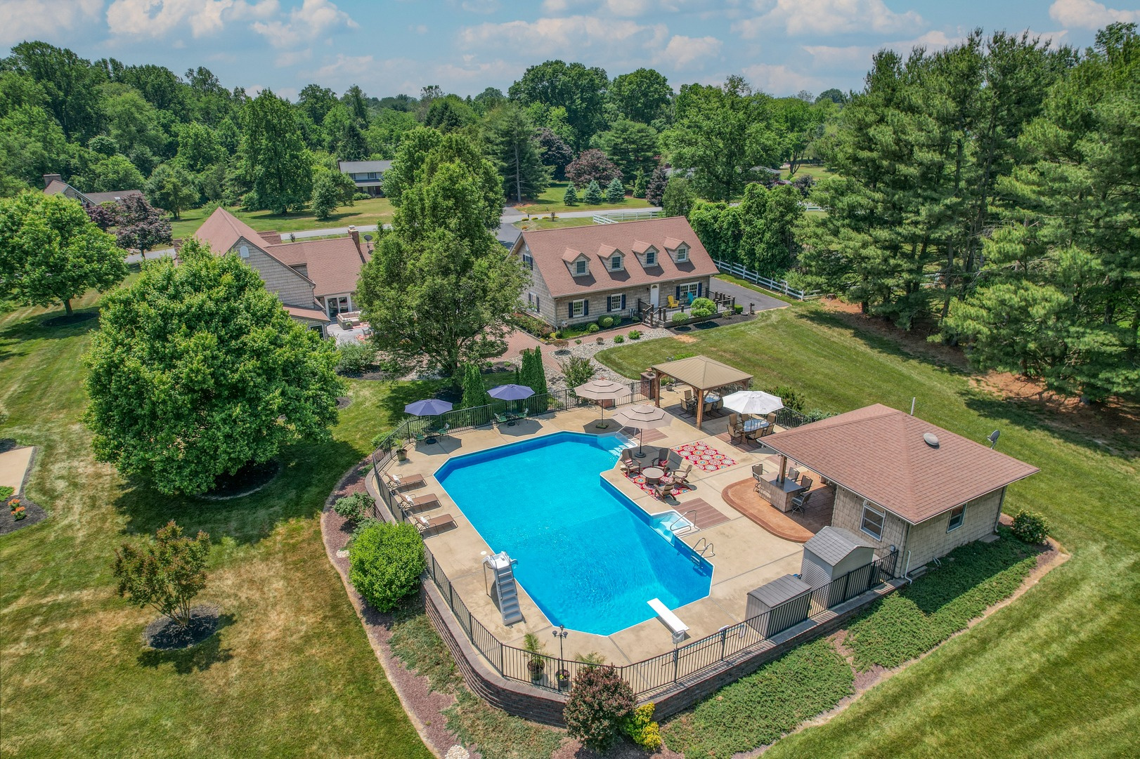 Indulge in the ultimate outdoor retreat with your very own approximately 48,000-gallon saltwater inground pool featuring a diving board, sliding board, and an elevated design that boasts a stunning custom paver wall adorned with pillars and complemented by a sleek black fence. Surrounding the pool, you'll find ample space for lounging and entertaining, while a gazebo with sun-blocking screens provides a shaded oasis for relaxation.