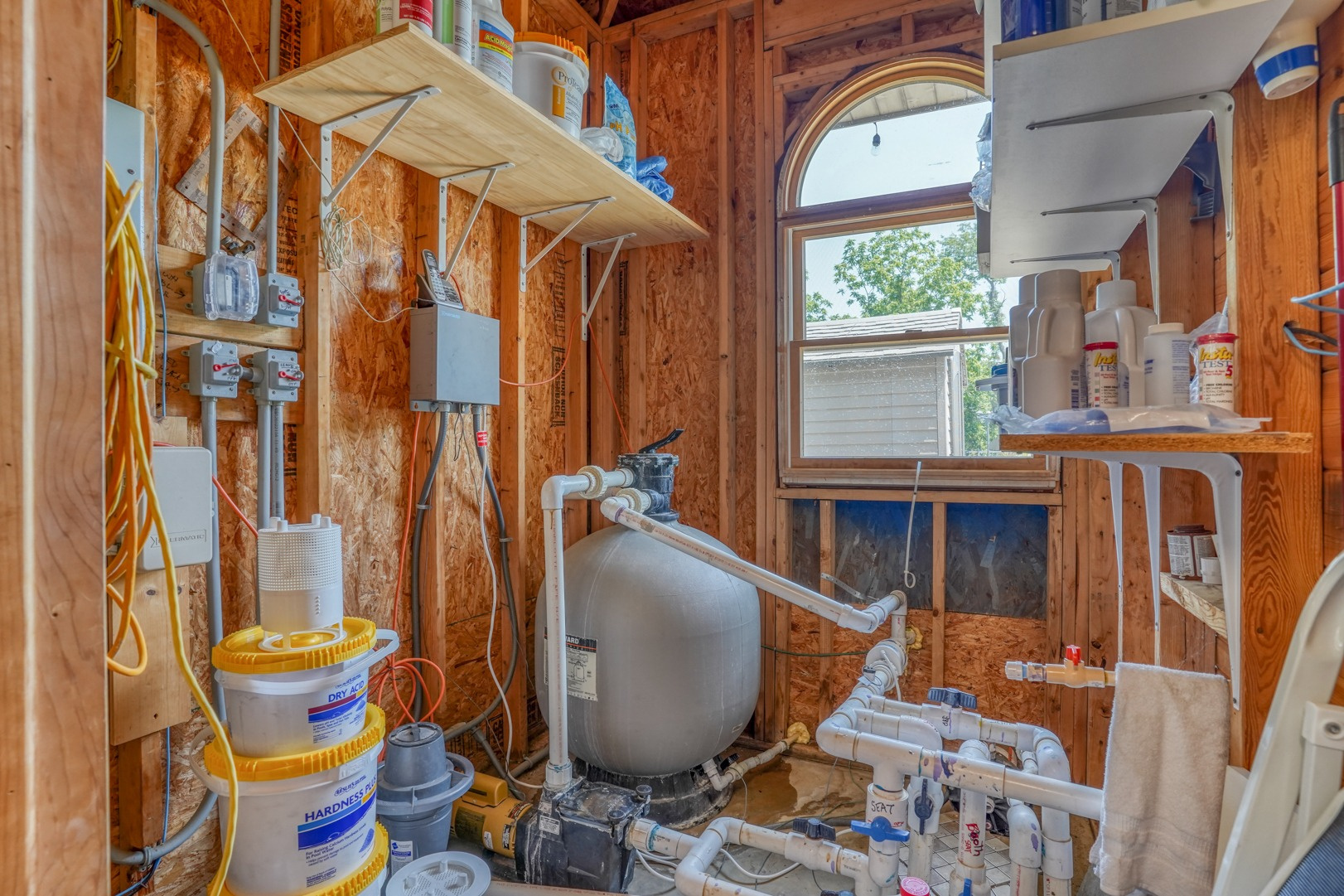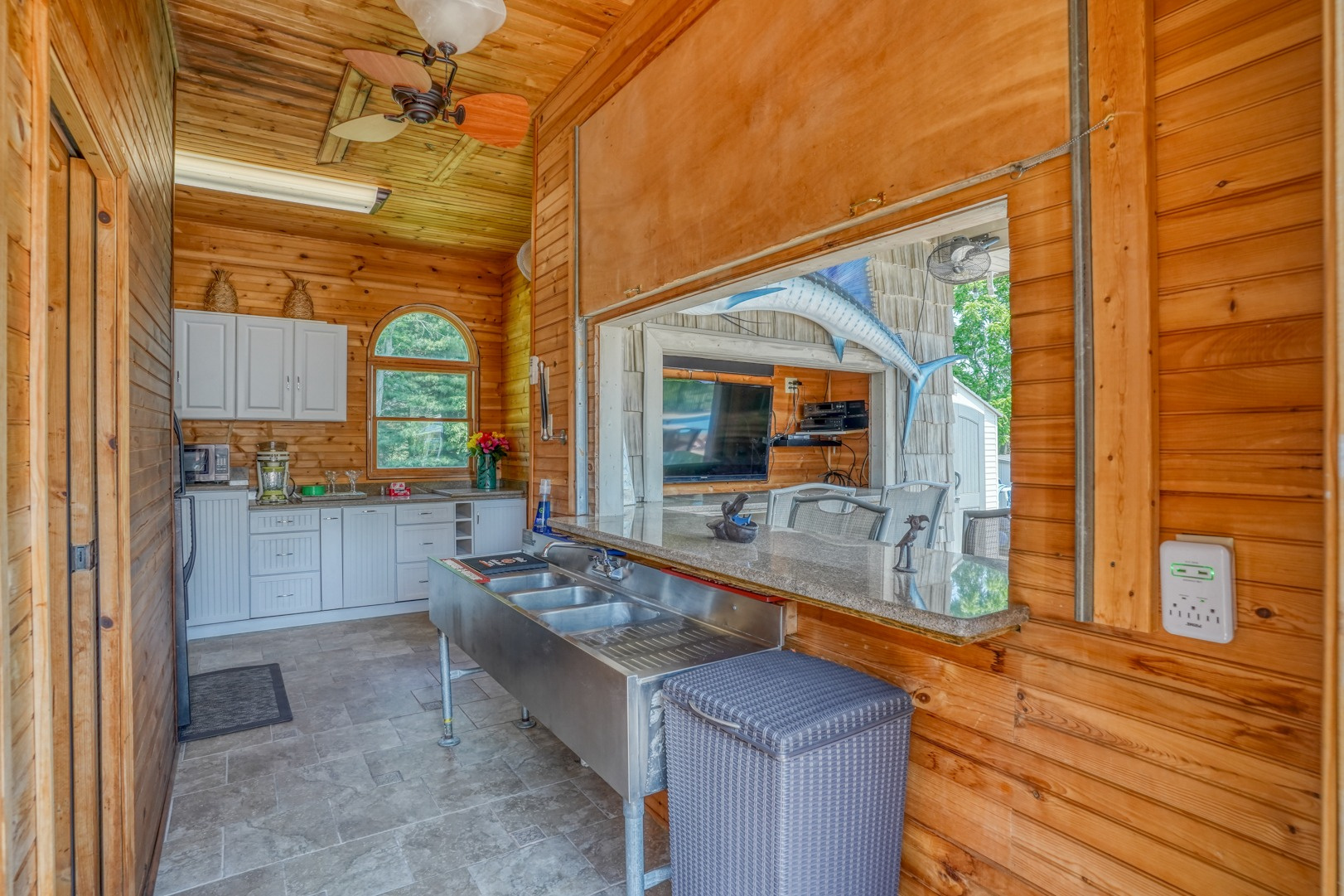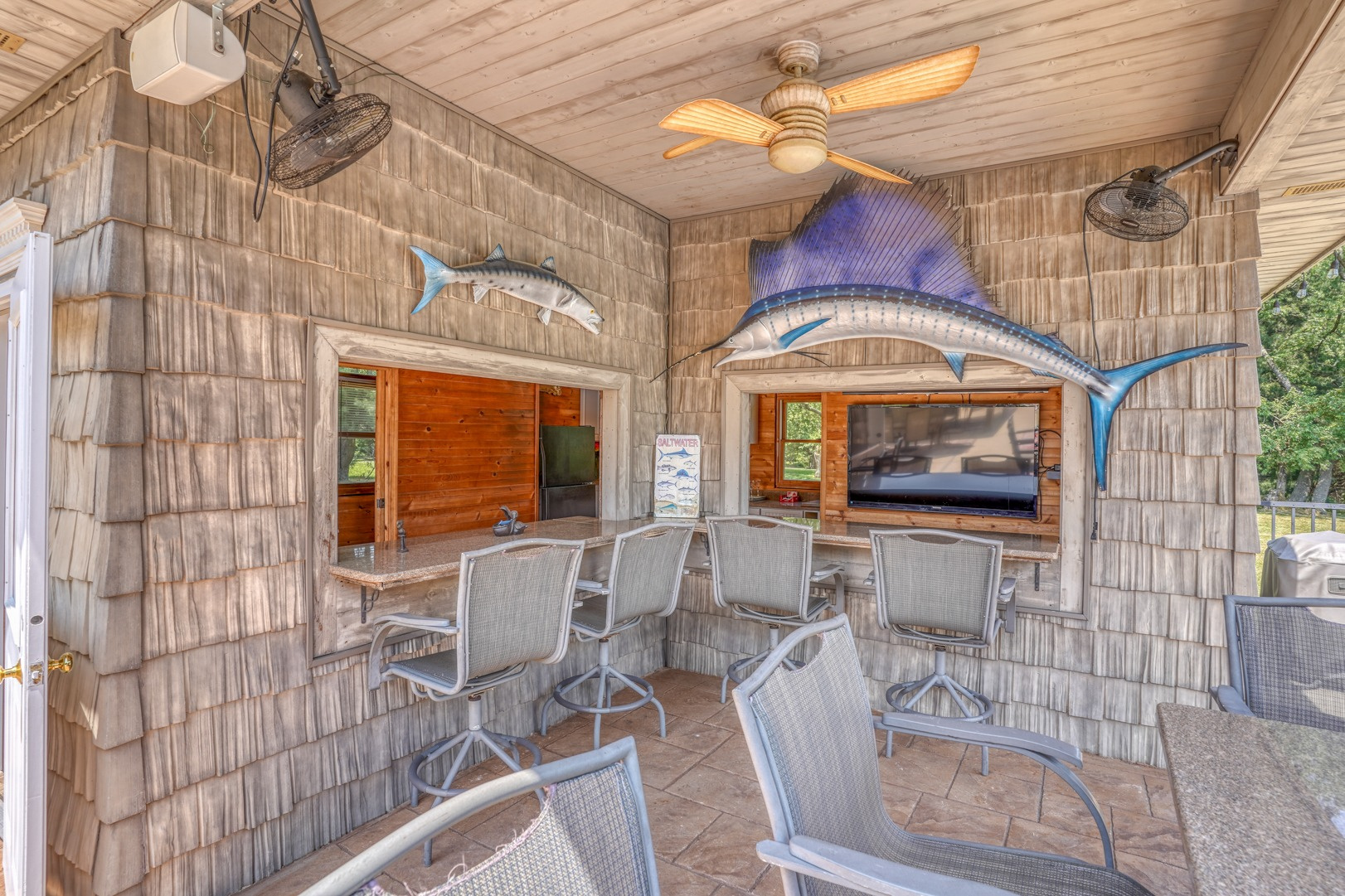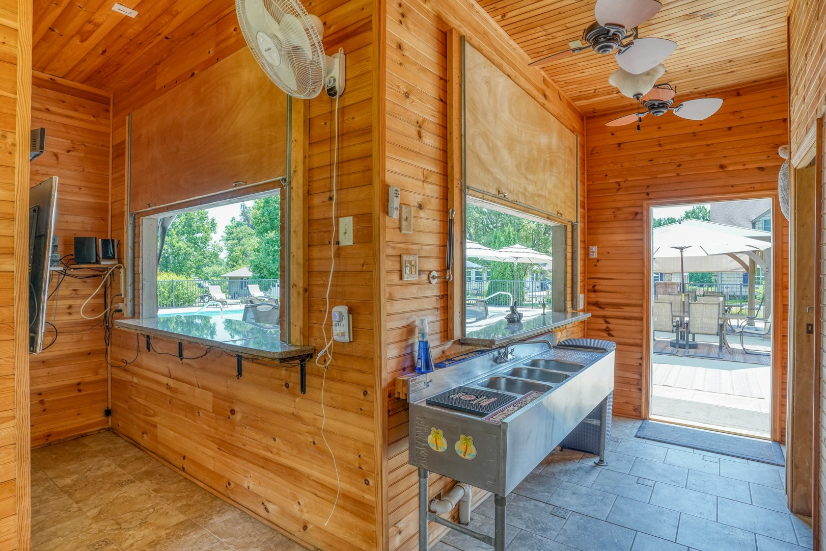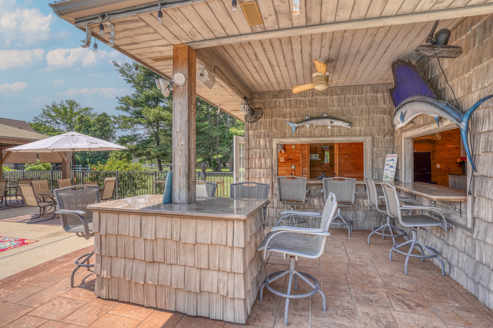 Prepare to be amazed by the pool house, an entertainer's dream. Outdoor bar seating awaits beneath a covered roof equipped with retractable awnings for customizable shade options. Inside, discover a wealth of conveniences including a bar sink, a TV that can be viewed from outside, stylish tile flooring, a full bathroom with a tiled shower, cabinets, a microwave, a refrigerator, a ceiling fan, and a dedicated pool pump room. With a backyard retreat like this, you won't need to venture far for your summer vacation.