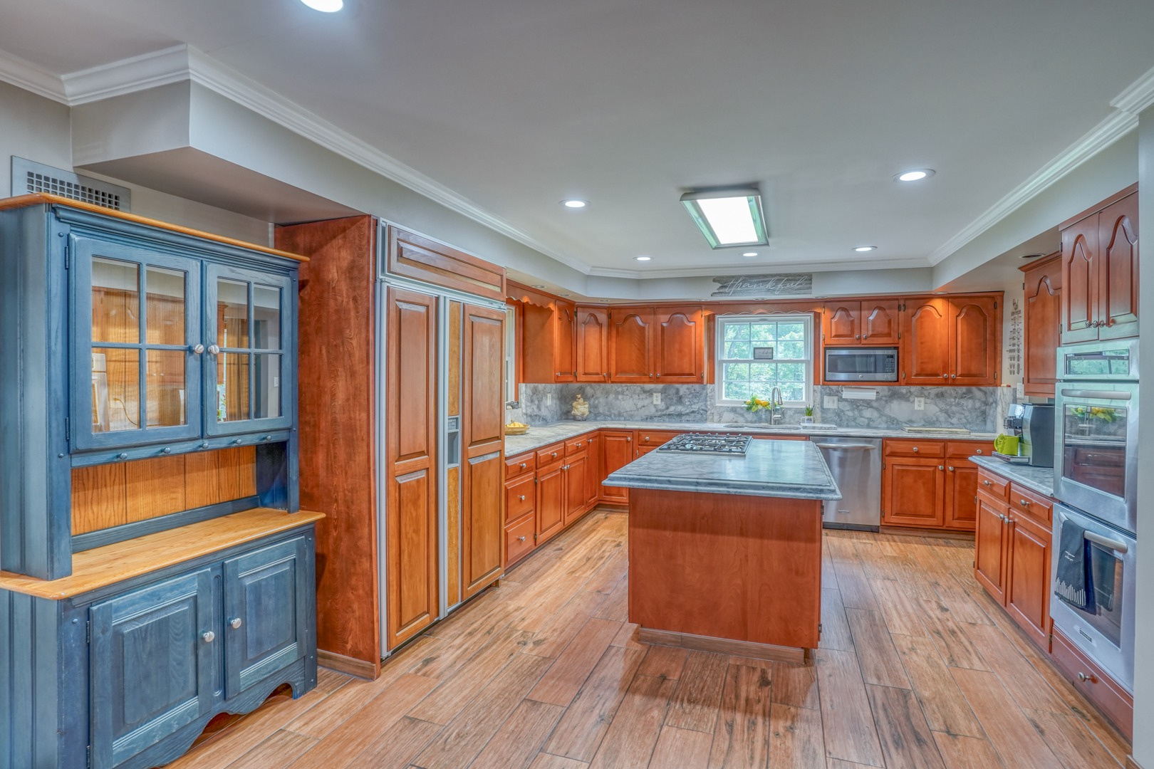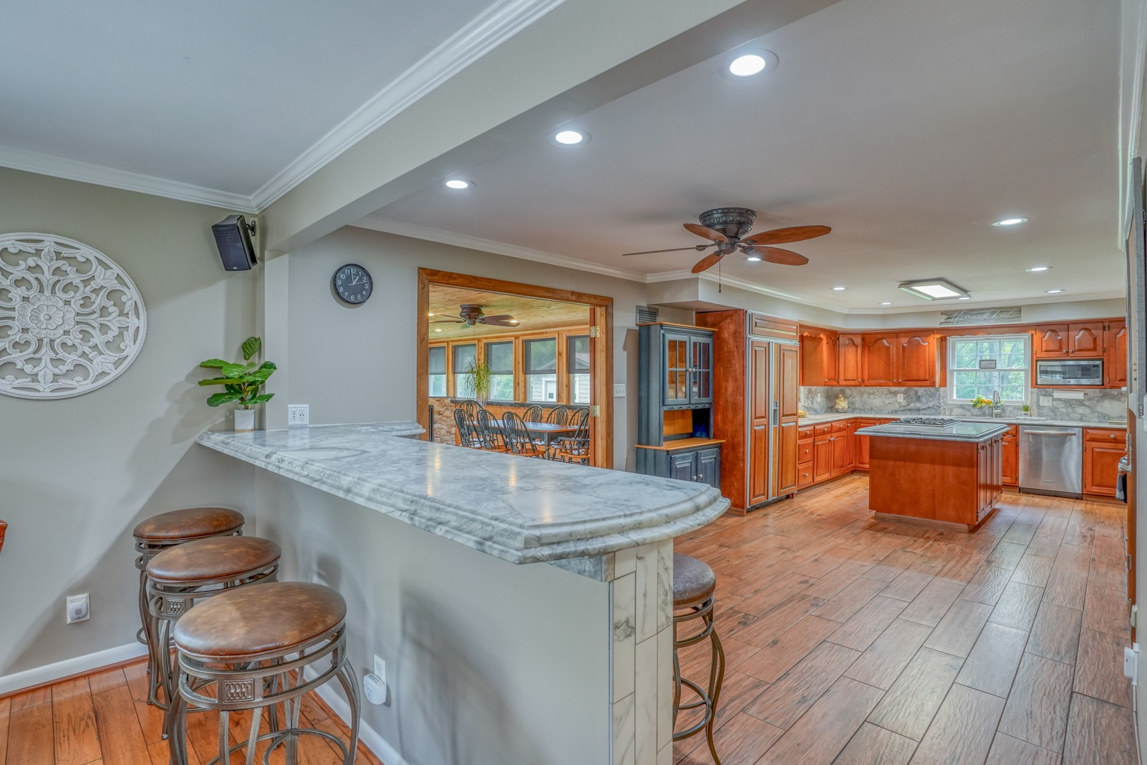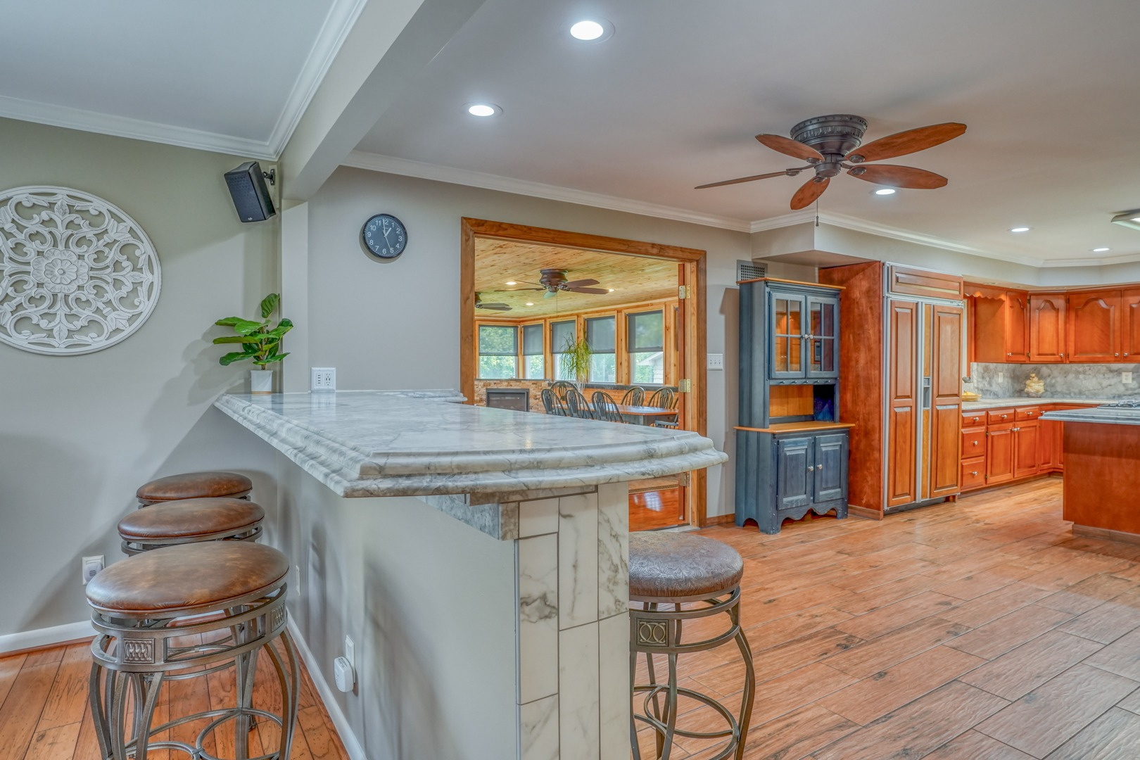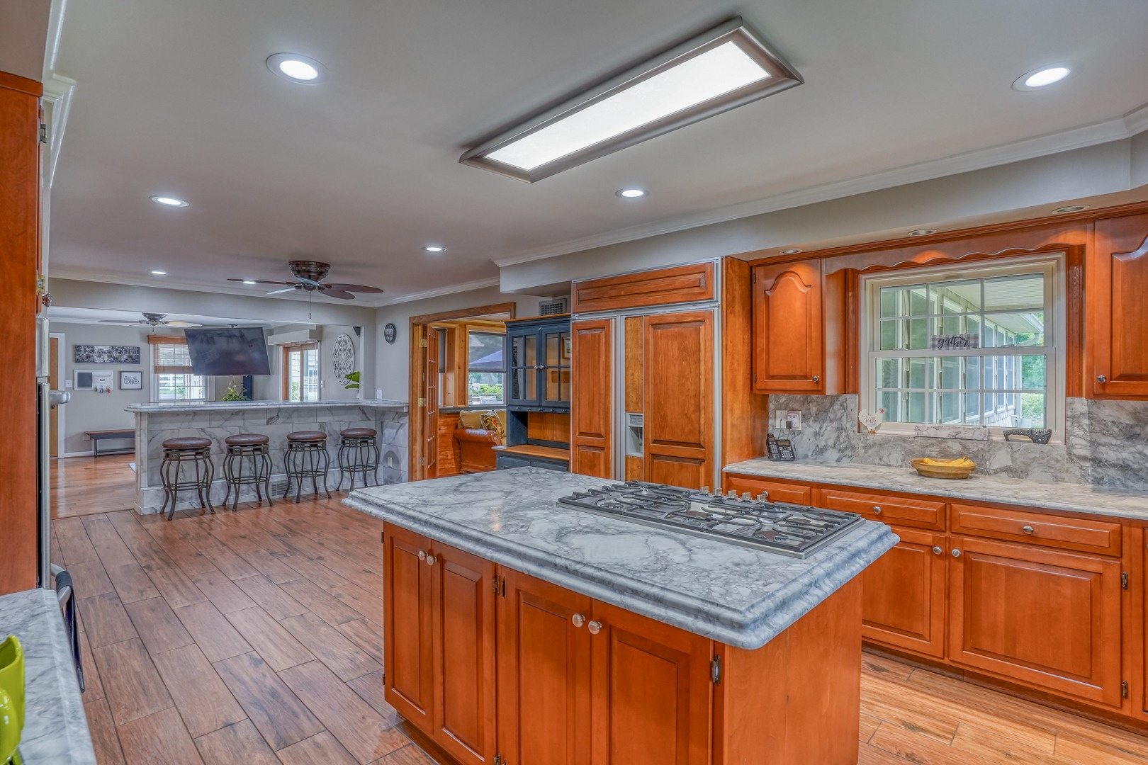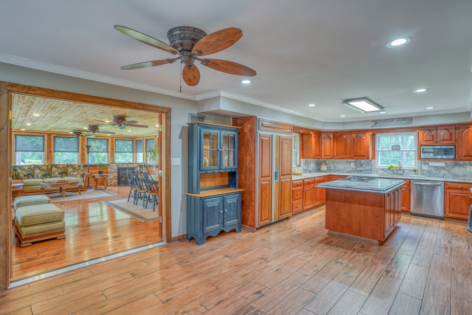 The kitchen is very large, showcasing high-end leathered granite counters and backsplash. The center island with counter seating boasts a double layer of granite, creating a striking design element. Additional kitchen highlights include crown molding, recessed lights, a Sub-Zero fridge, a gas stove top on the center island, a double oven with convection cooking, cherry cabinets, and an expansive 8' x 6' pantry. The pantry, originally a laundry room, can easily be converted back for added convenience. It features rolling rack shelving and a stainless mop sink. French doors from the kitchen lead to the breathtaking sunroom/porch, featuring pine ceilings and walls, numerous windows with granite shelving to invite ample natural light, a wet bar, a stone-faced corner gas fireplace, wide wood plank flooring, and access to the deck. This versatile space can serve as a serene sitting room, a lively game room, or an elegant dining area, tailored to your preferences. A powder room completes the first floor.