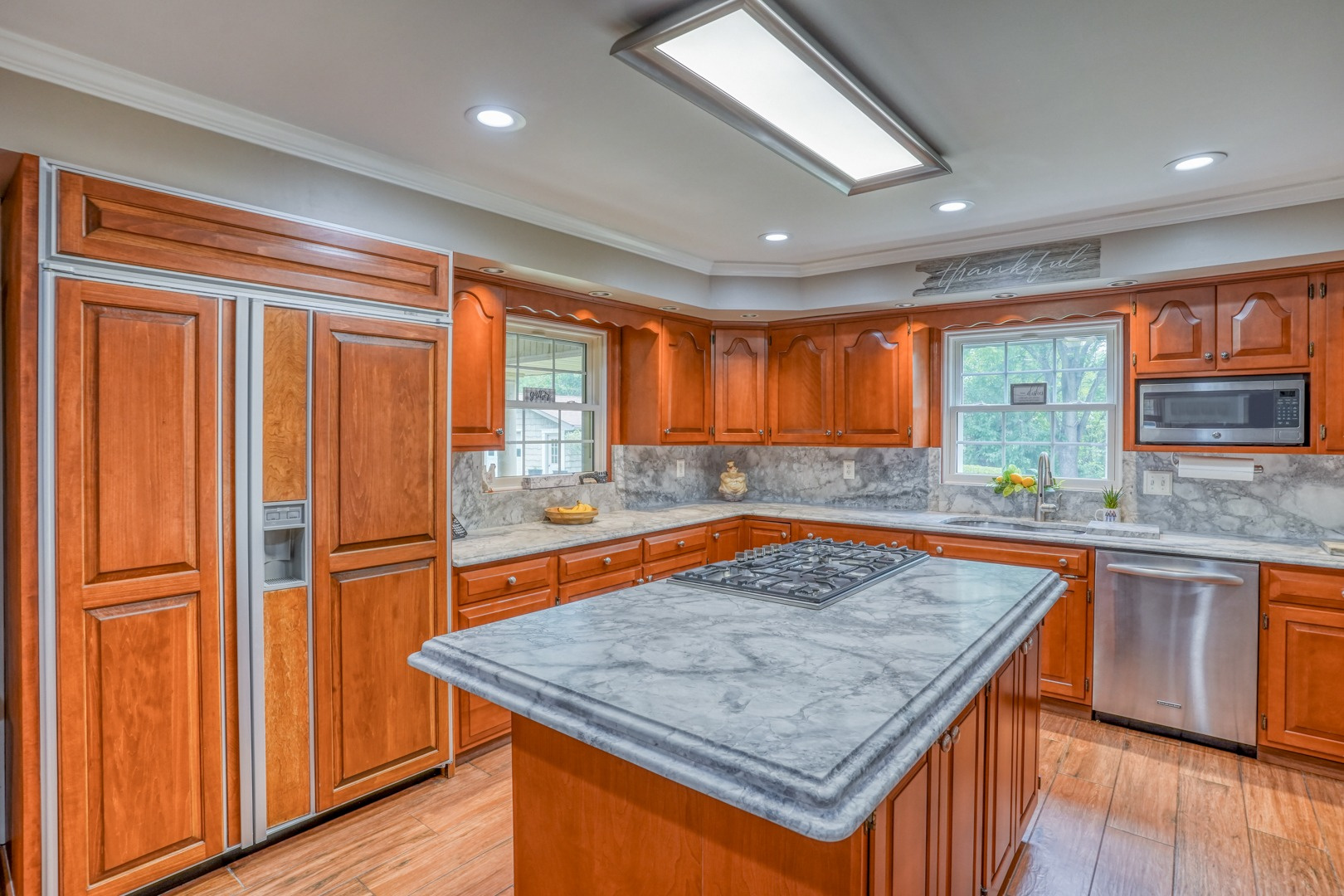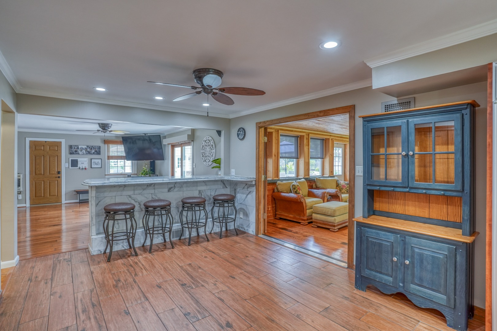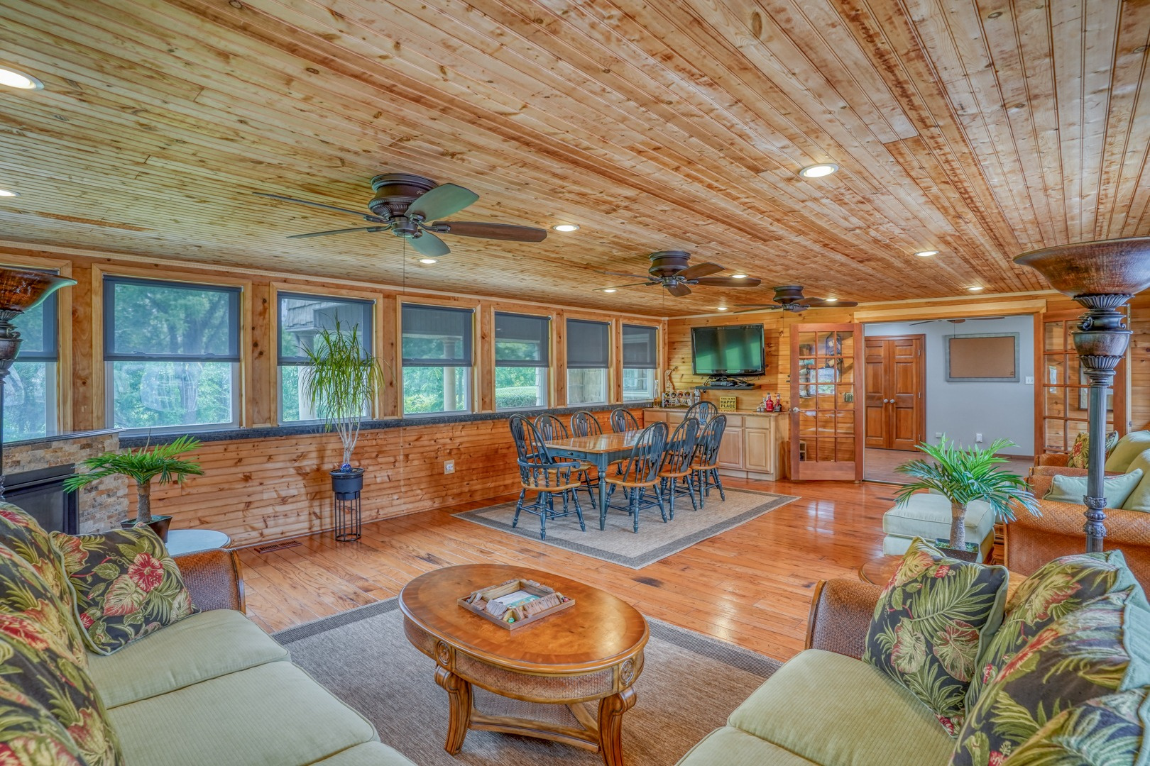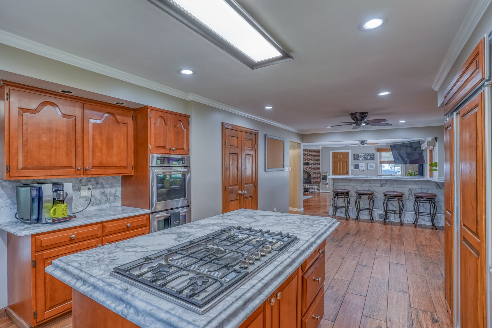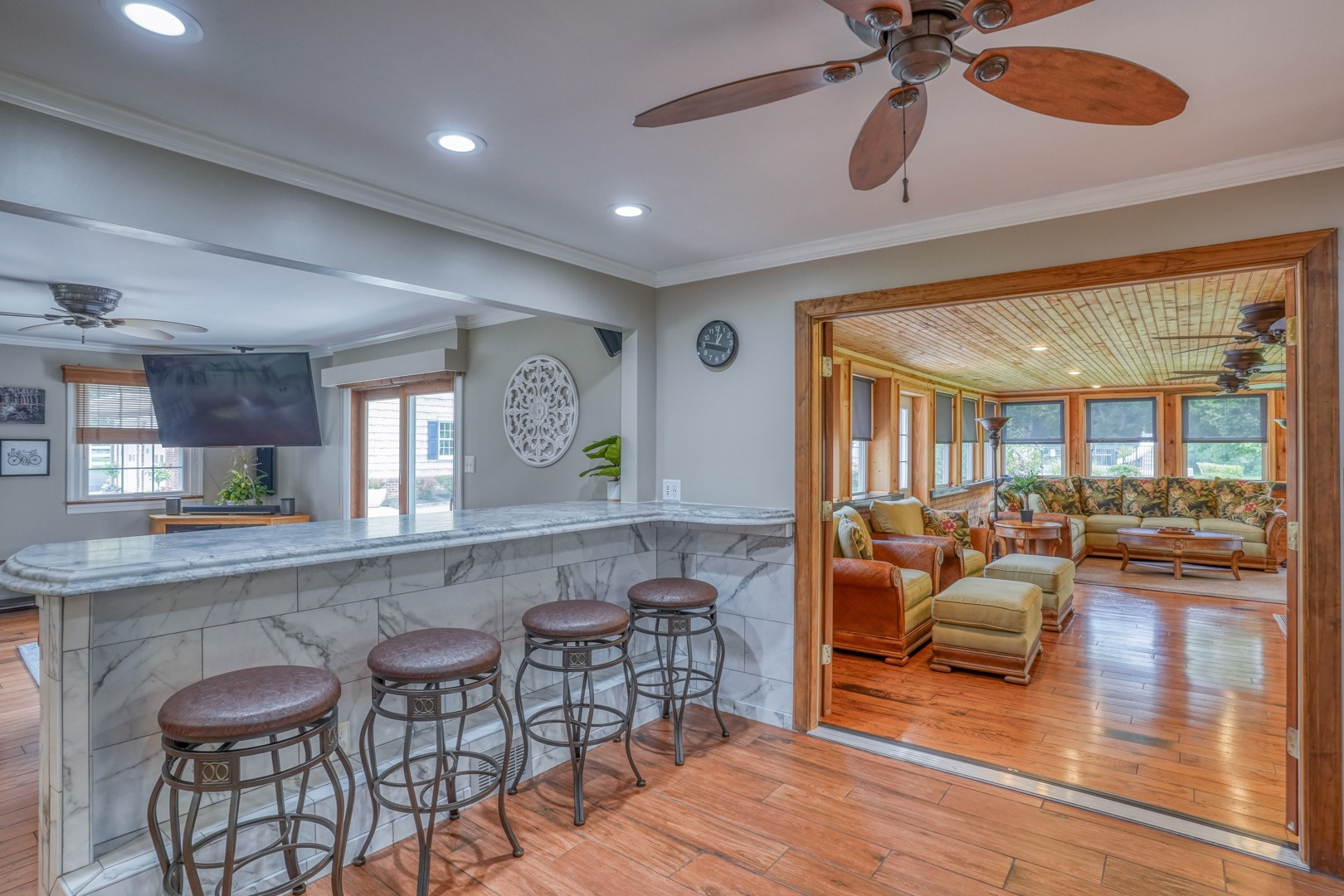 The kitchen is very large, showcasing high-end leathered granite counters and backsplash. The center island with counter seating boasts a double layer of granite, creating a striking design element. Additional kitchen highlights include crown molding, recessed lights, a Sub-Zero fridge, a gas stove top on the center island, a double oven with convection cooking, cherry cabinets, and an expansive 8' x 6' pantry. The pantry, originally a laundry room, can easily be converted back for added convenience. It features rolling rack shelving and a stainless mop sink. French doors from the kitchen lead to the breathtaking sunroom/porch, featuring pine ceilings and walls, numerous windows with granite shelving to invite ample natural light, a wet bar, a stone-faced corner gas fireplace, wide wood plank flooring, and access to the deck. This versatile space can serve as a serene sitting room, a lively game room, or an elegant dining area, tailored to your preferences. A powder room completes the first floor.