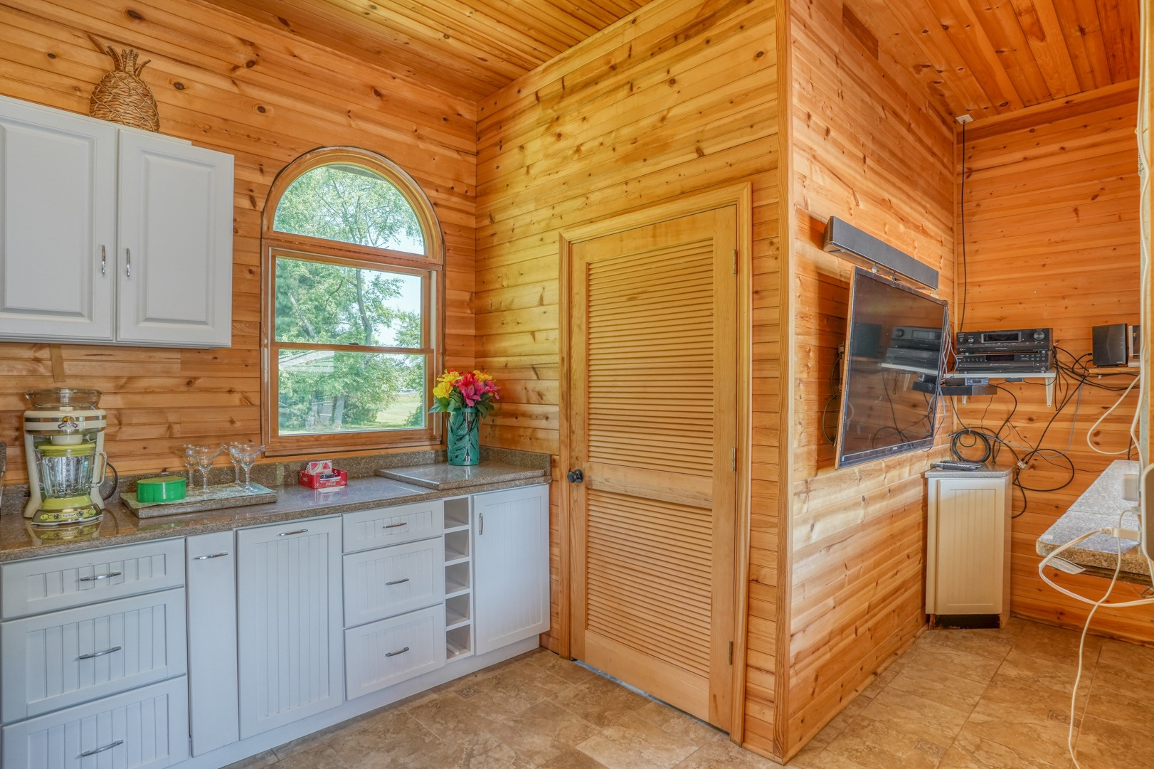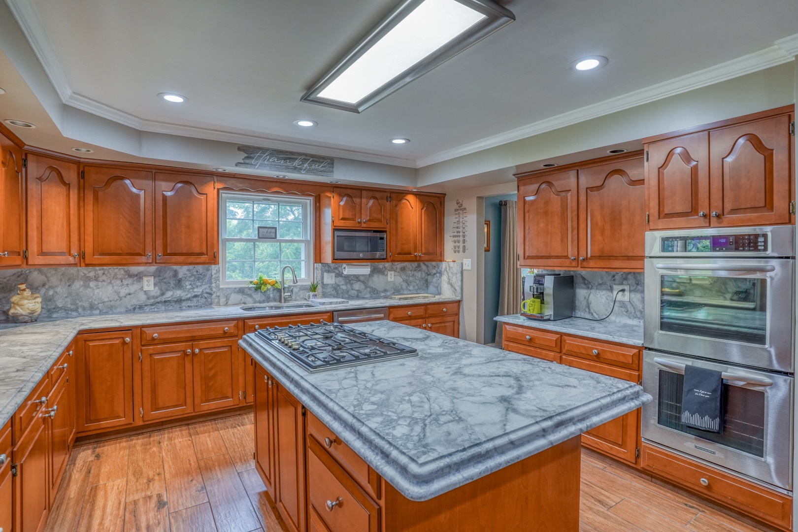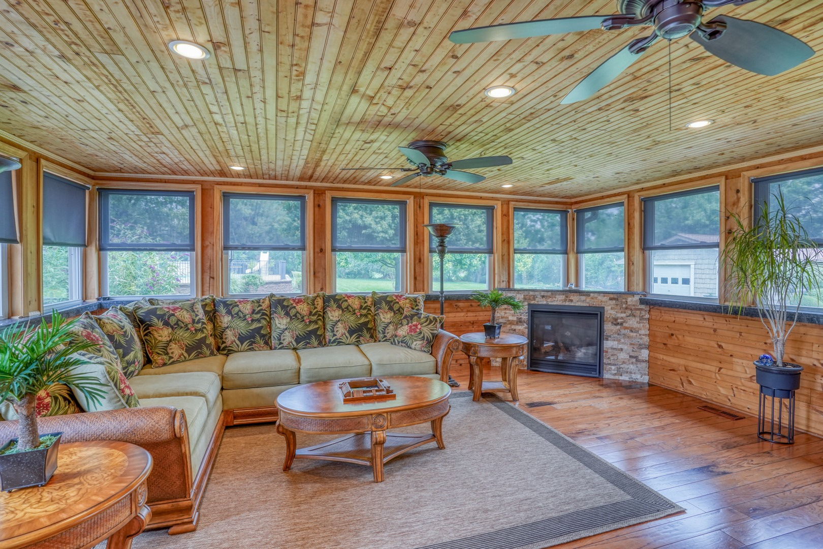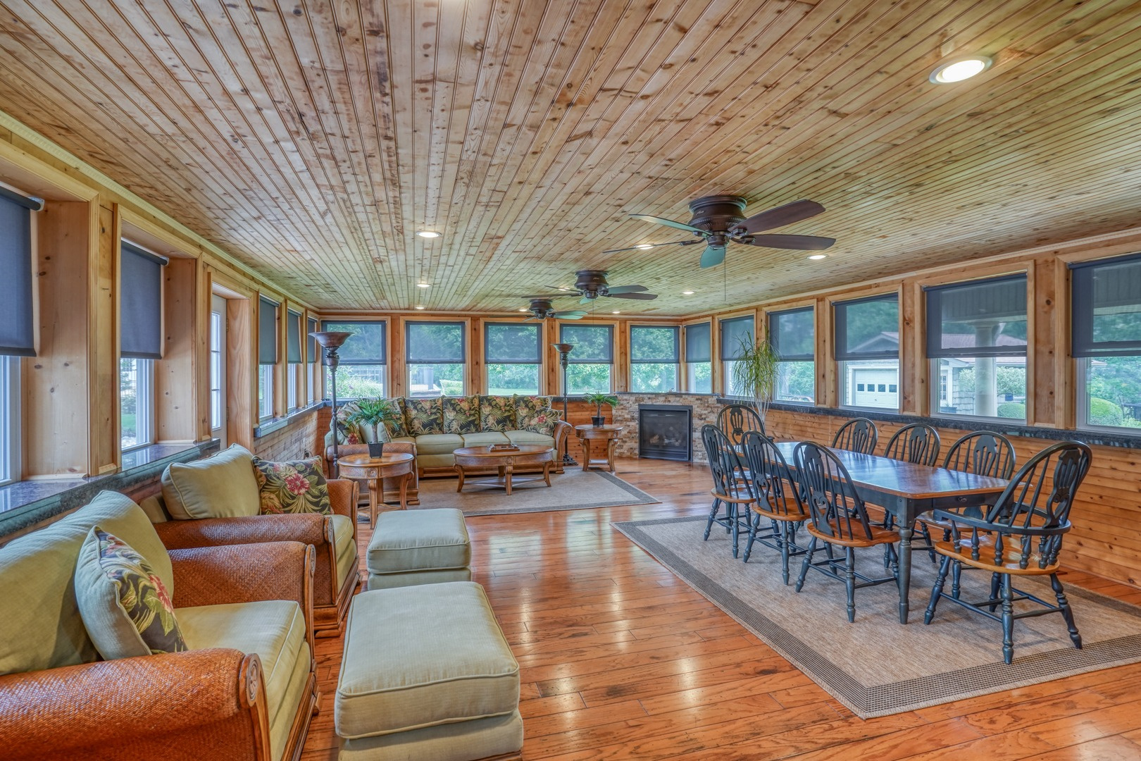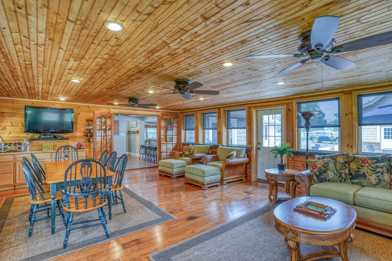 The kitchen is very large, showcasing high-end leathered granite counters and backsplash. The center island with counter seating boasts a double layer of granite, creating a striking design element. Additional kitchen highlights include crown molding, recessed lights, a Sub-Zero fridge, a gas stove top on the center island, a double oven with convection cooking, cherry cabinets, and an expansive 8' x 6' pantry. The pantry, originally a laundry room, can easily be converted back for added convenience. It features rolling rack shelving and a stainless mop sink. French doors from the kitchen lead to the breathtaking sunroom/porch, featuring pine ceilings and walls, numerous windows with granite shelving to invite ample natural light, a wet bar, a stone-faced corner gas fireplace, wide wood plank flooring, and access to the deck. This versatile space can serve as a serene sitting room, a lively game room, or an elegant dining area, tailored to your preferences. A powder room completes the first floor.