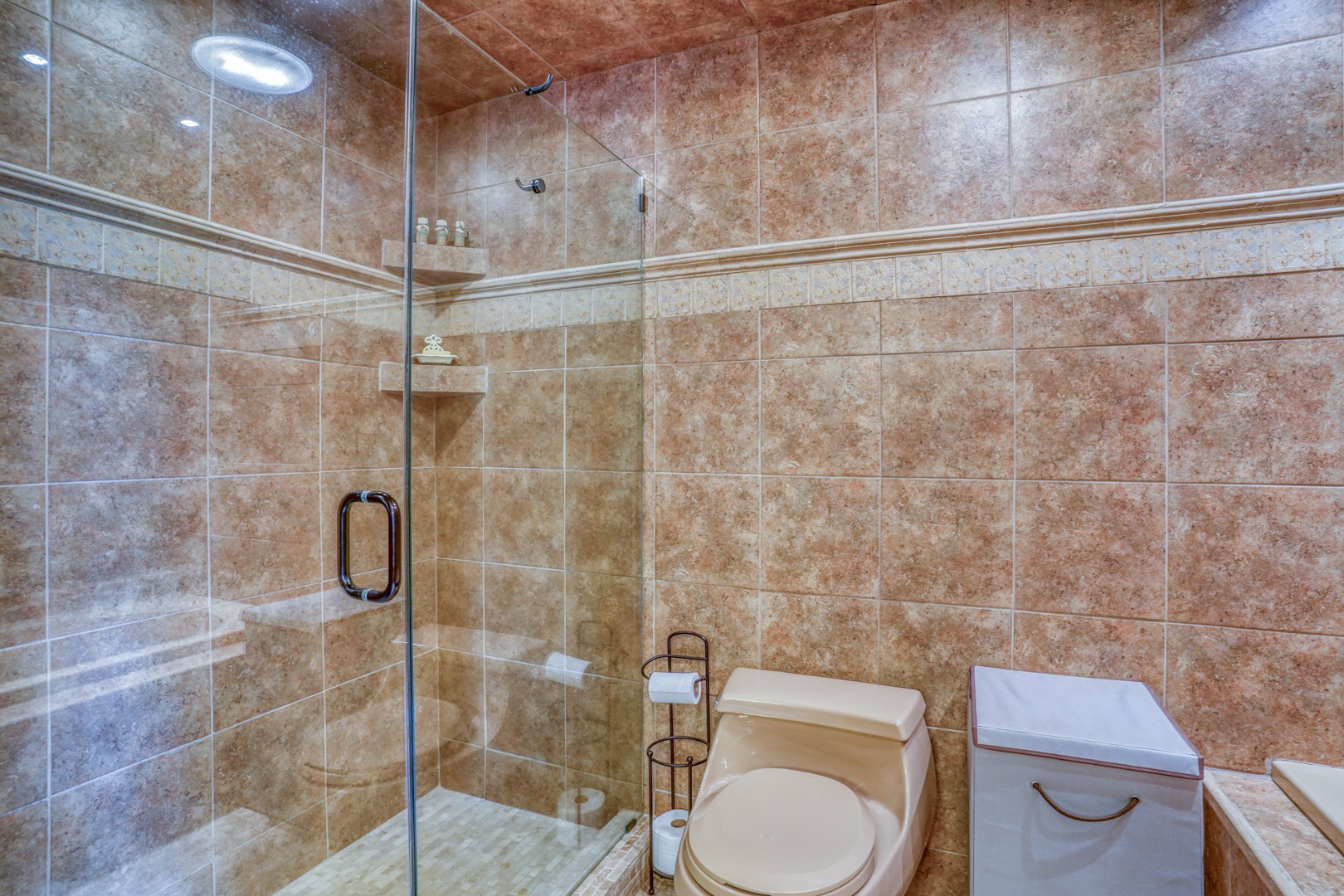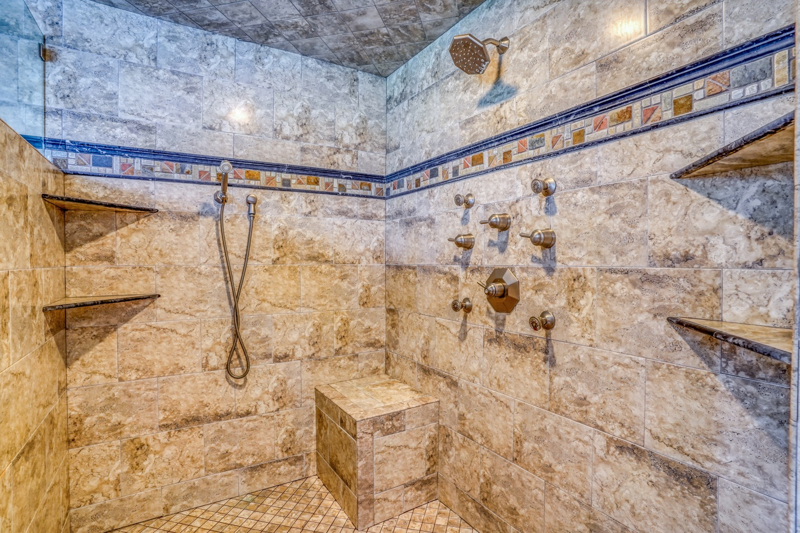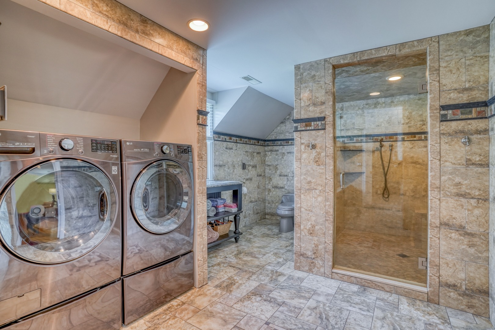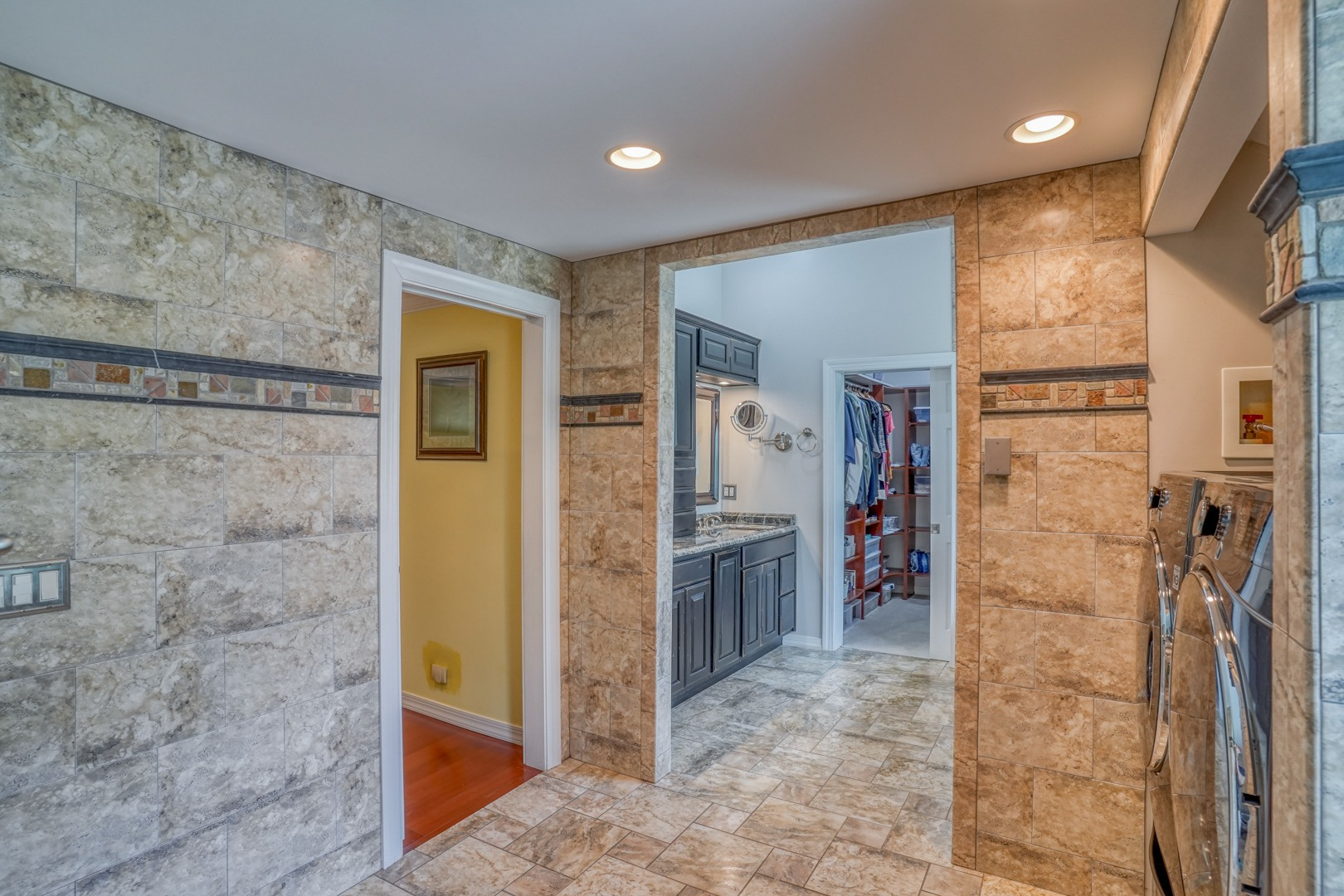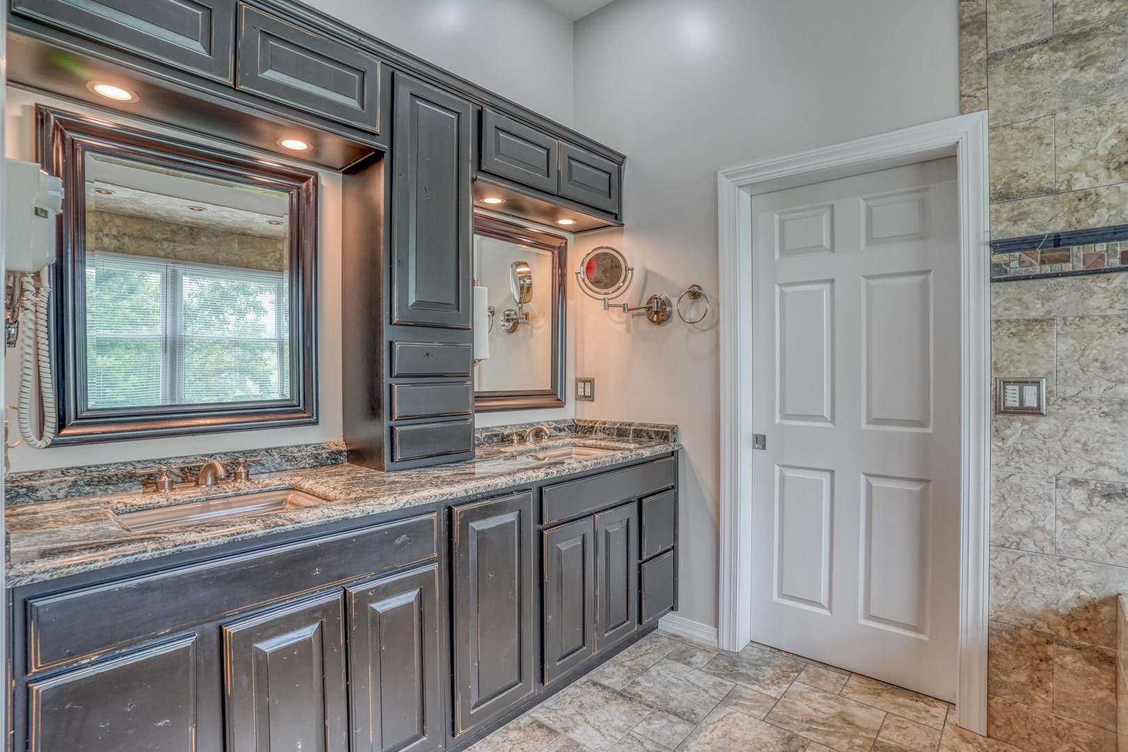 The kitchen is very large, showcasing high-end leathered granite counters and backsplash. The center island with counter seating boasts a double layer of granite, creating a striking design element. Additional kitchen highlights include crown molding, recessed lights, a Sub-Zero fridge, a gas stove top on the center island, a double oven with convection cooking, cherry cabinets, and an expansive 8' x 6' pantry. The pantry, originally a laundry room, can easily be converted back for added convenience. It features rolling rack shelving and a stainless mop sink. French doors from the kitchen lead to the breathtaking sunroom/porch, featuring pine ceilings and walls, numerous windows with granite shelving to invite ample natural light, a wet bar, a stone-faced corner gas fireplace, wide wood plank flooring, and access to the deck. This versatile space can serve as a serene sitting room, a lively game room, or an elegant dining area, tailored to your preferences. A powder room completes the first floor.