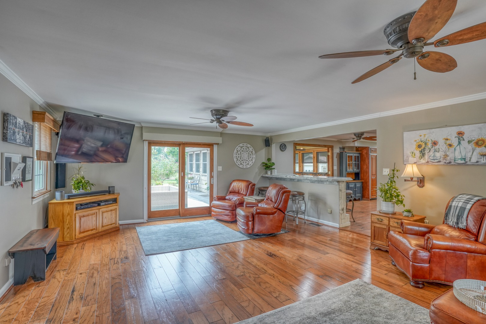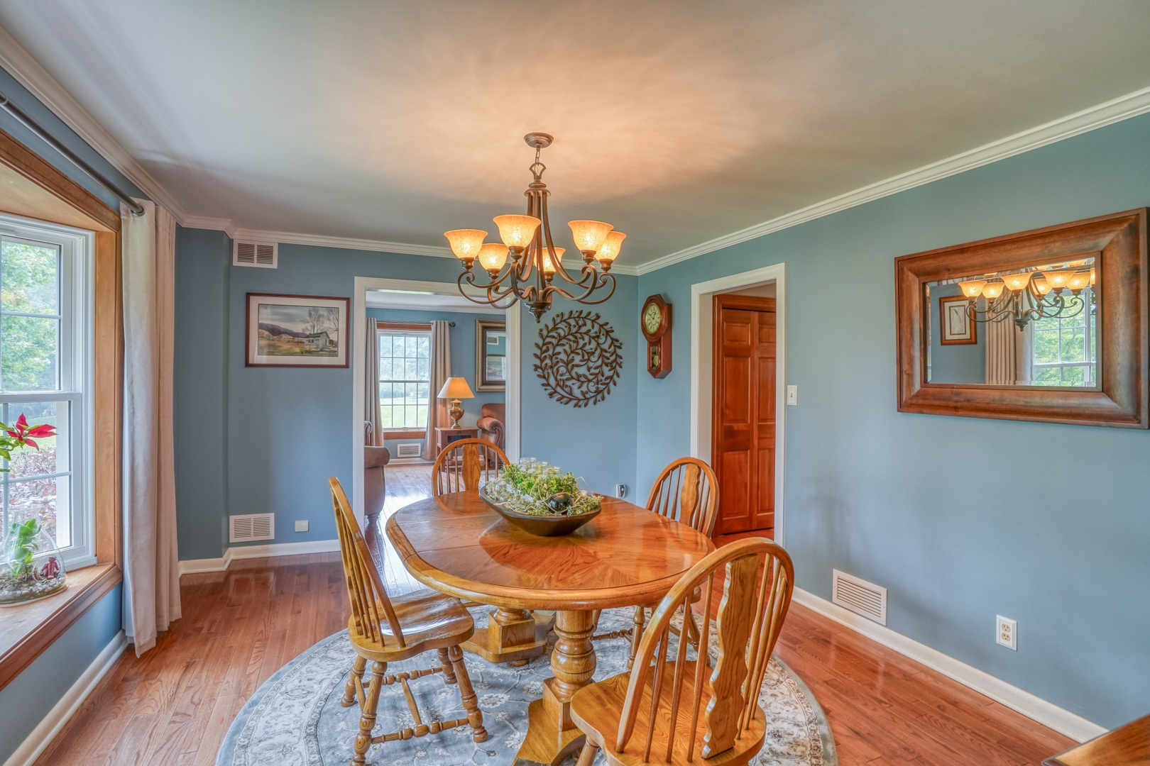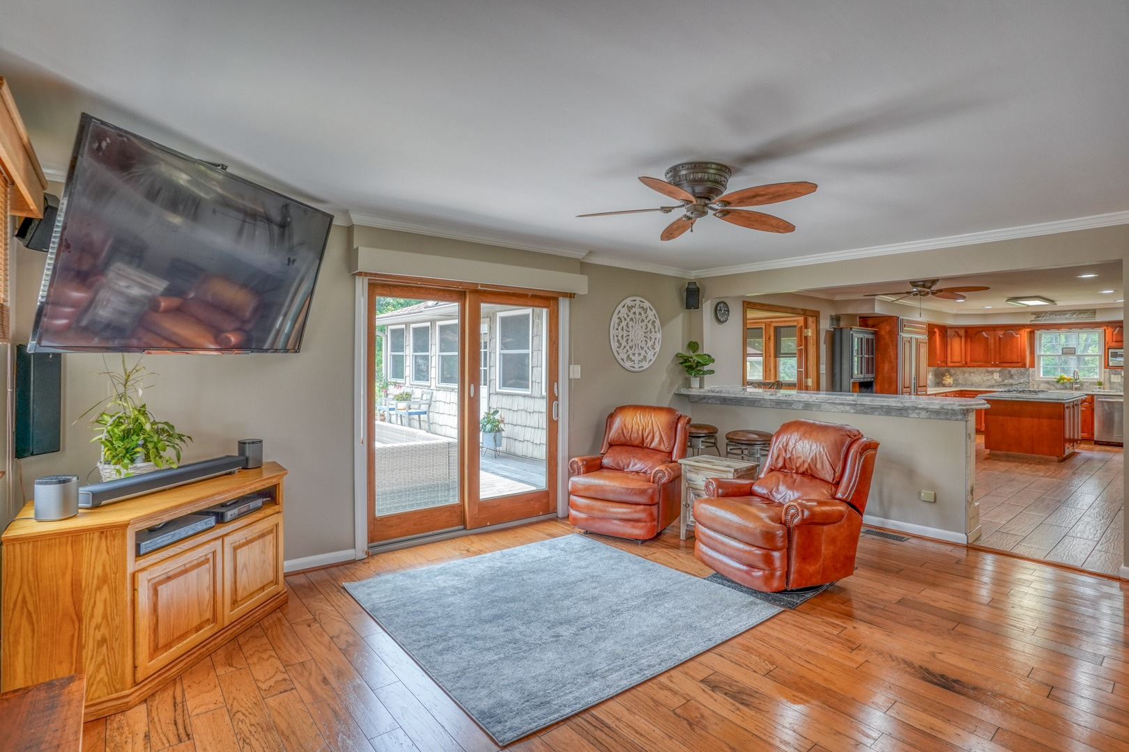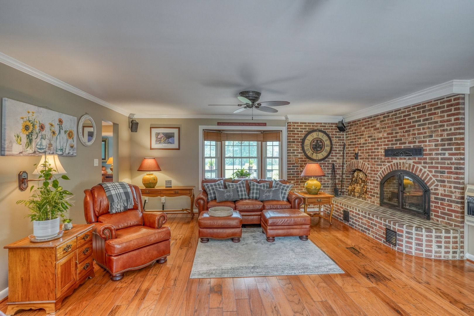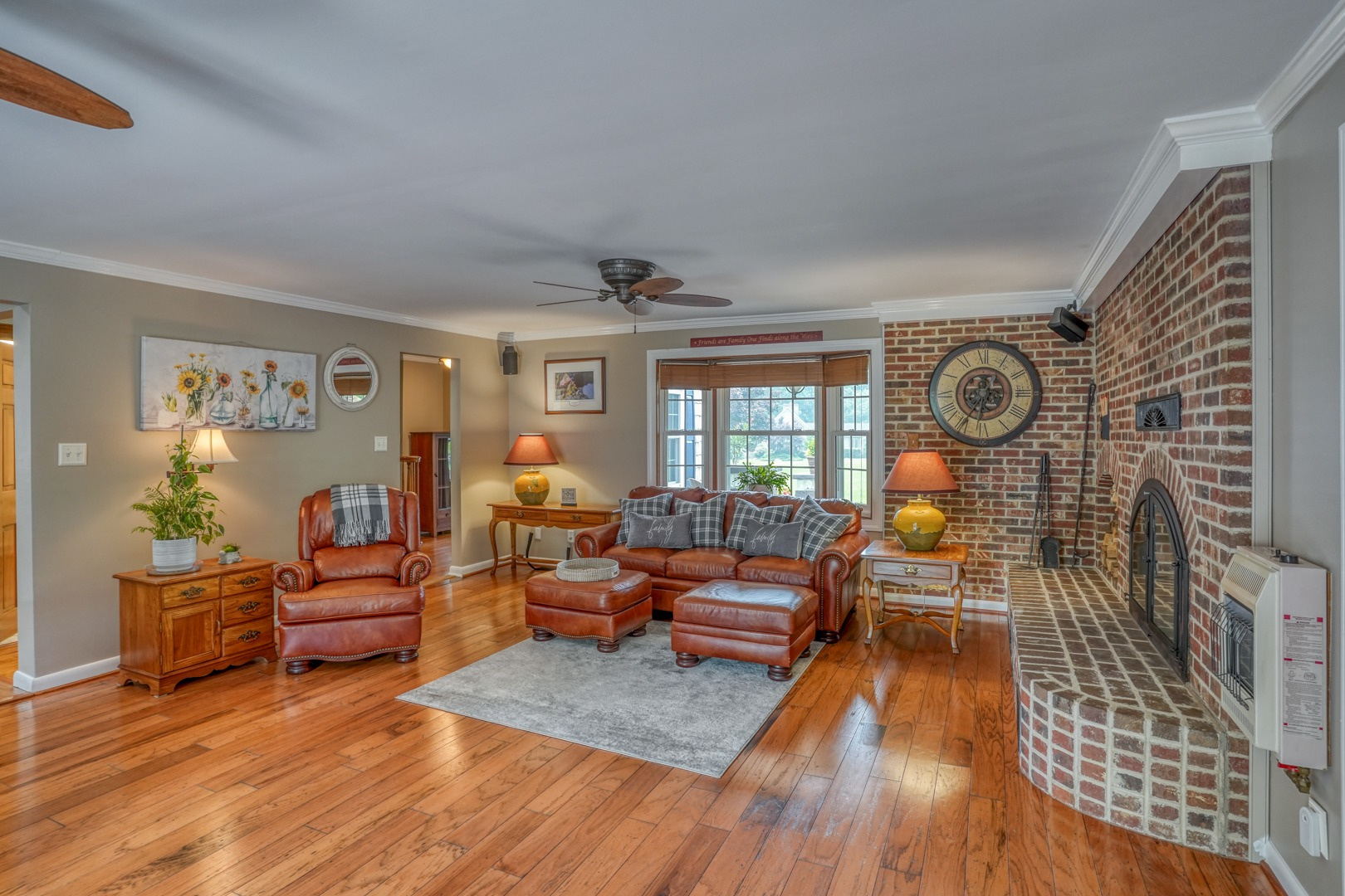 Step inside and be greeted by gleaming hardwood flooring that guides you through the main level. A traditional living room adjacent to the foyer can easily transform into a distinguished executive office with the addition of French doors. Connected to the living room, a formal dining room continues the theme of hardwood flooring, tasteful paint, and crown molding. The family room, kitchen, and sunroom present an ideal space for entertaining, featuring abundant windows that frame the picturesque views outside. Revel in the warmth of the brick wood-burning fireplace, complete with built-in wood storage, in the family room. This room also boasts wide plank flooring, a bay window overlooking the front porch, a slider to the rear deck, access to the attached garage, and ceiling fans to enhance comfort.