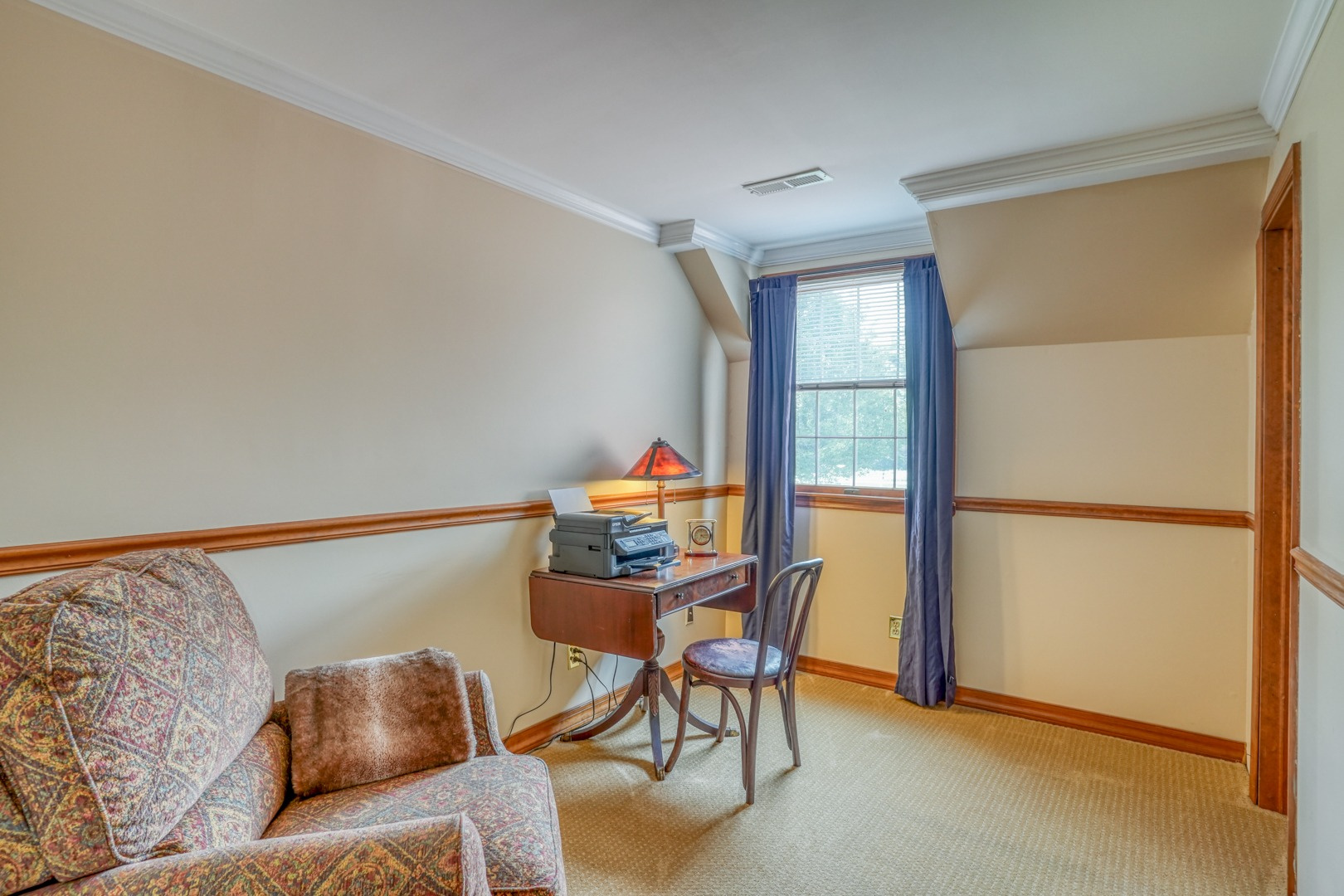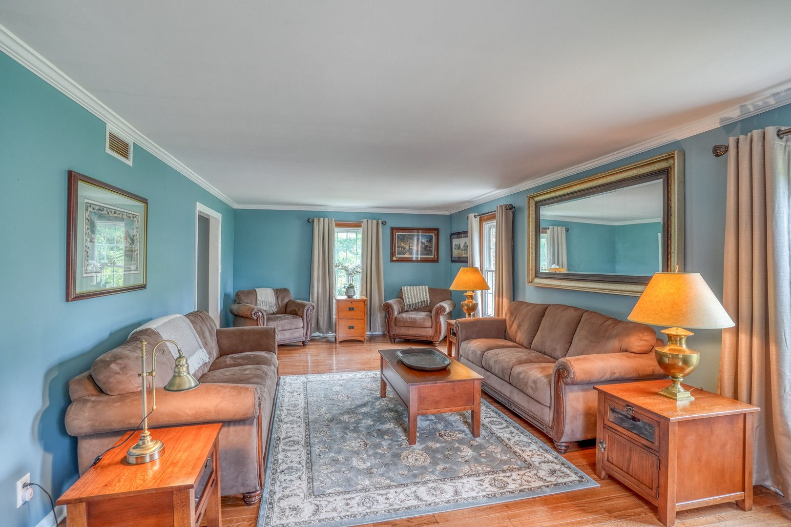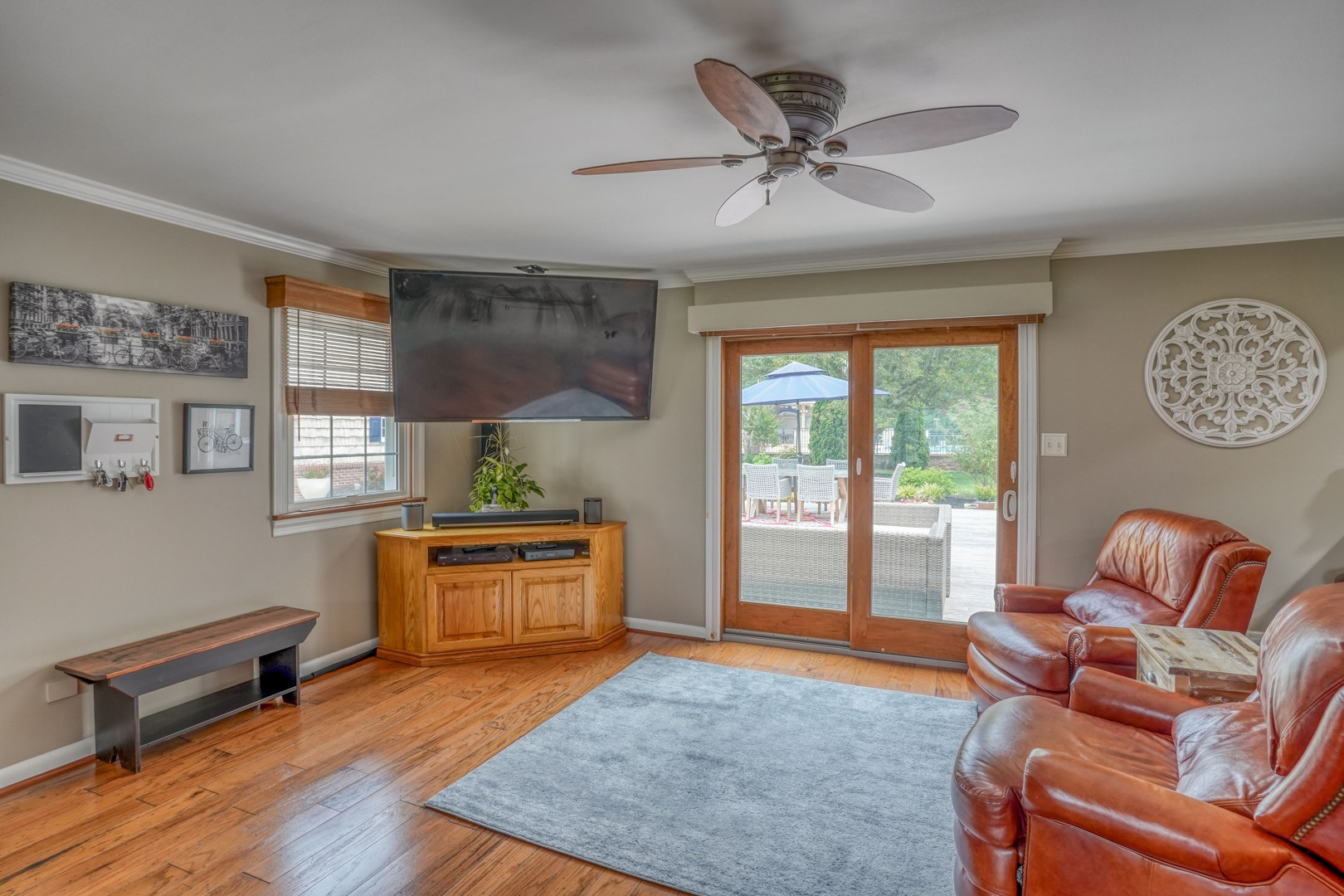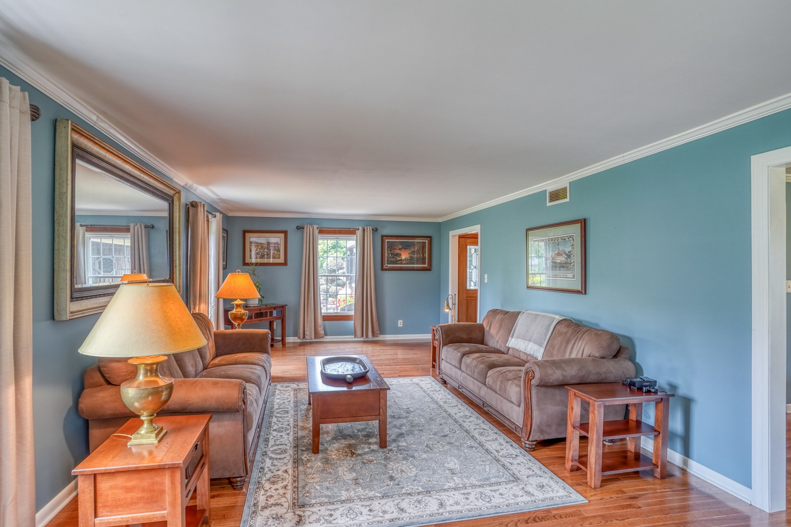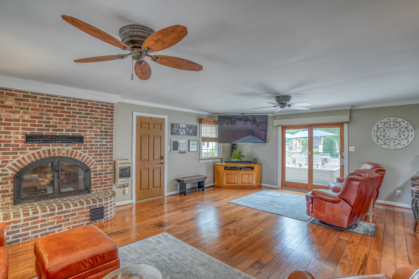 Step inside and be greeted by gleaming hardwood flooring that guides you through the main level. A traditional living room adjacent to the foyer can easily transform into a distinguished executive office with the addition of French doors. Connected to the living room, a formal dining room continues the theme of hardwood flooring, tasteful paint, and crown molding. The family room, kitchen, and sunroom present an ideal space for entertaining, featuring abundant windows that frame the picturesque views outside. Revel in the warmth of the brick wood-burning fireplace, complete with built-in wood storage, in the family room. This room also boasts wide plank flooring, a bay window overlooking the front porch, a slider to the rear deck, access to the attached garage, and ceiling fans to enhance comfort.