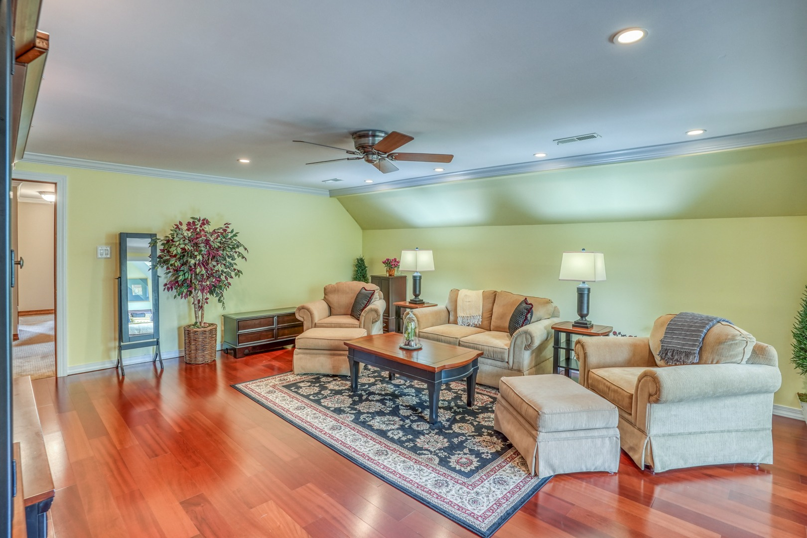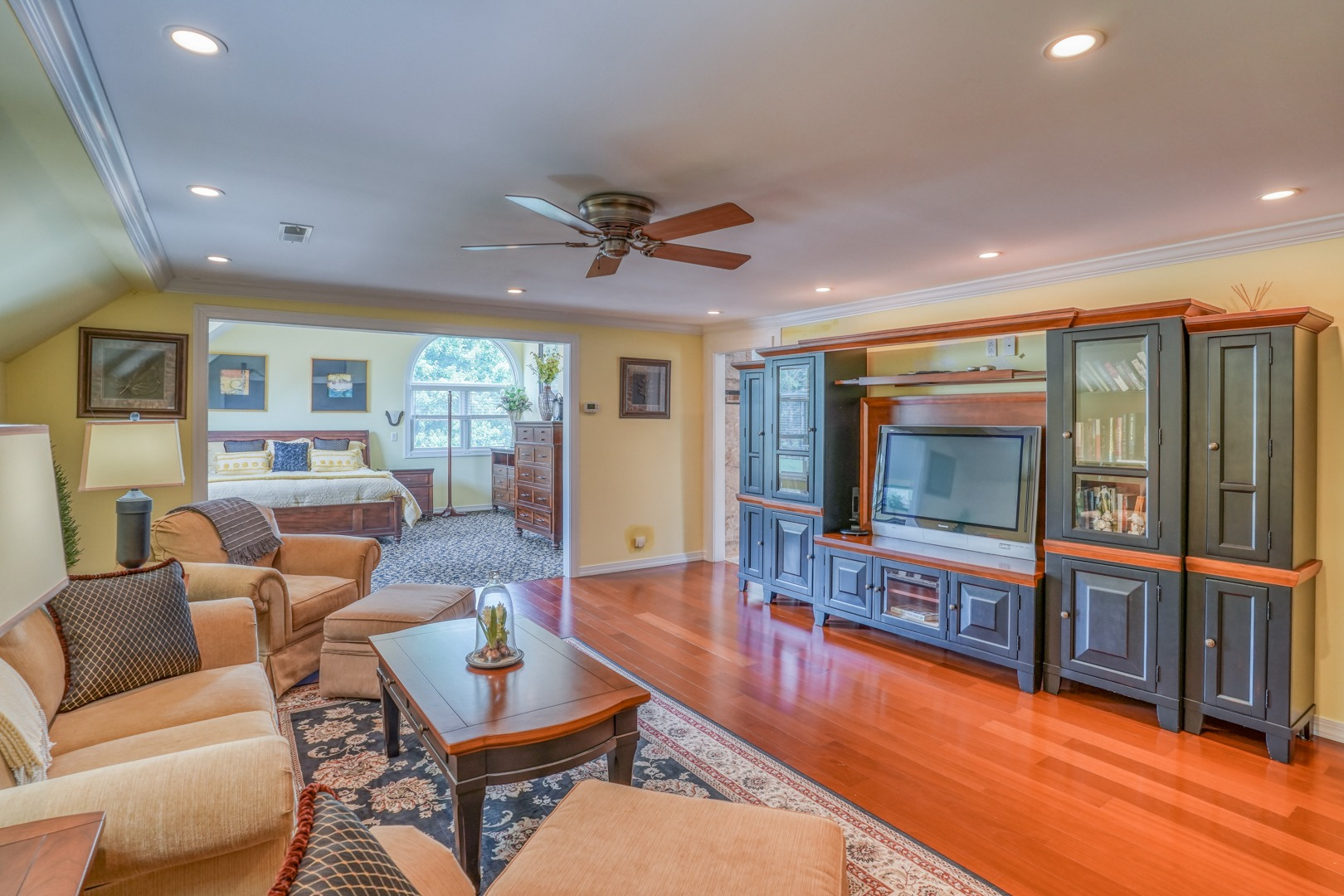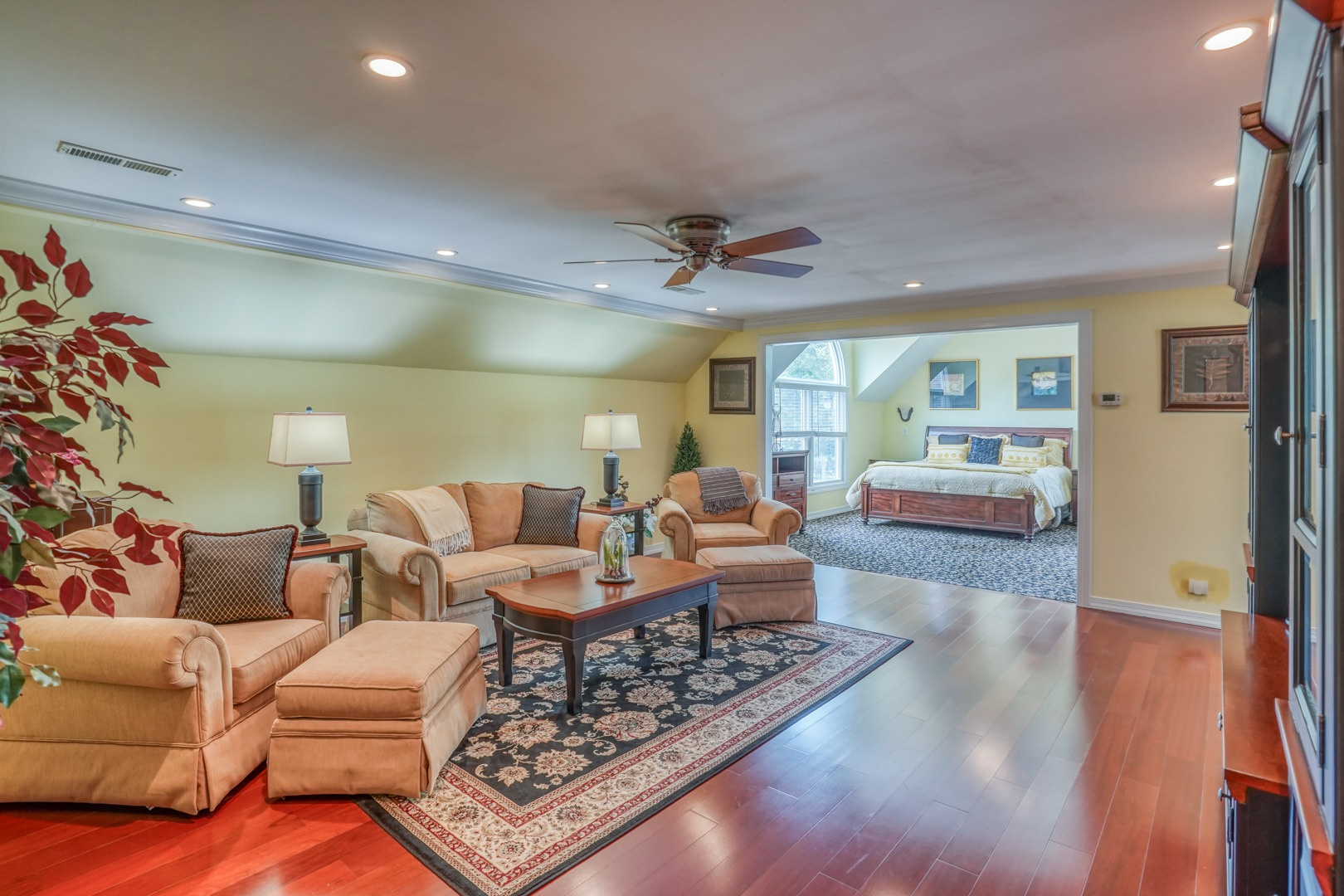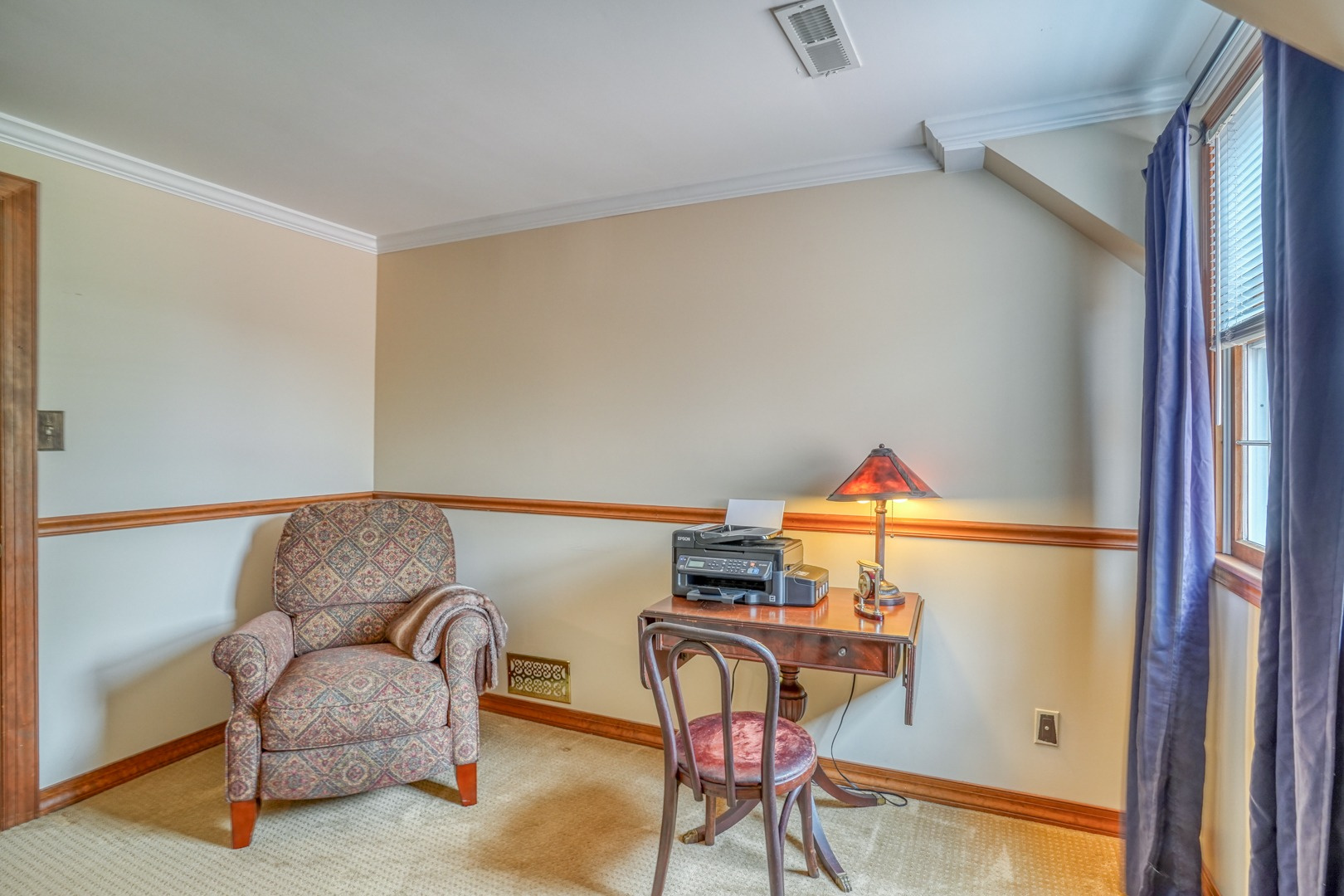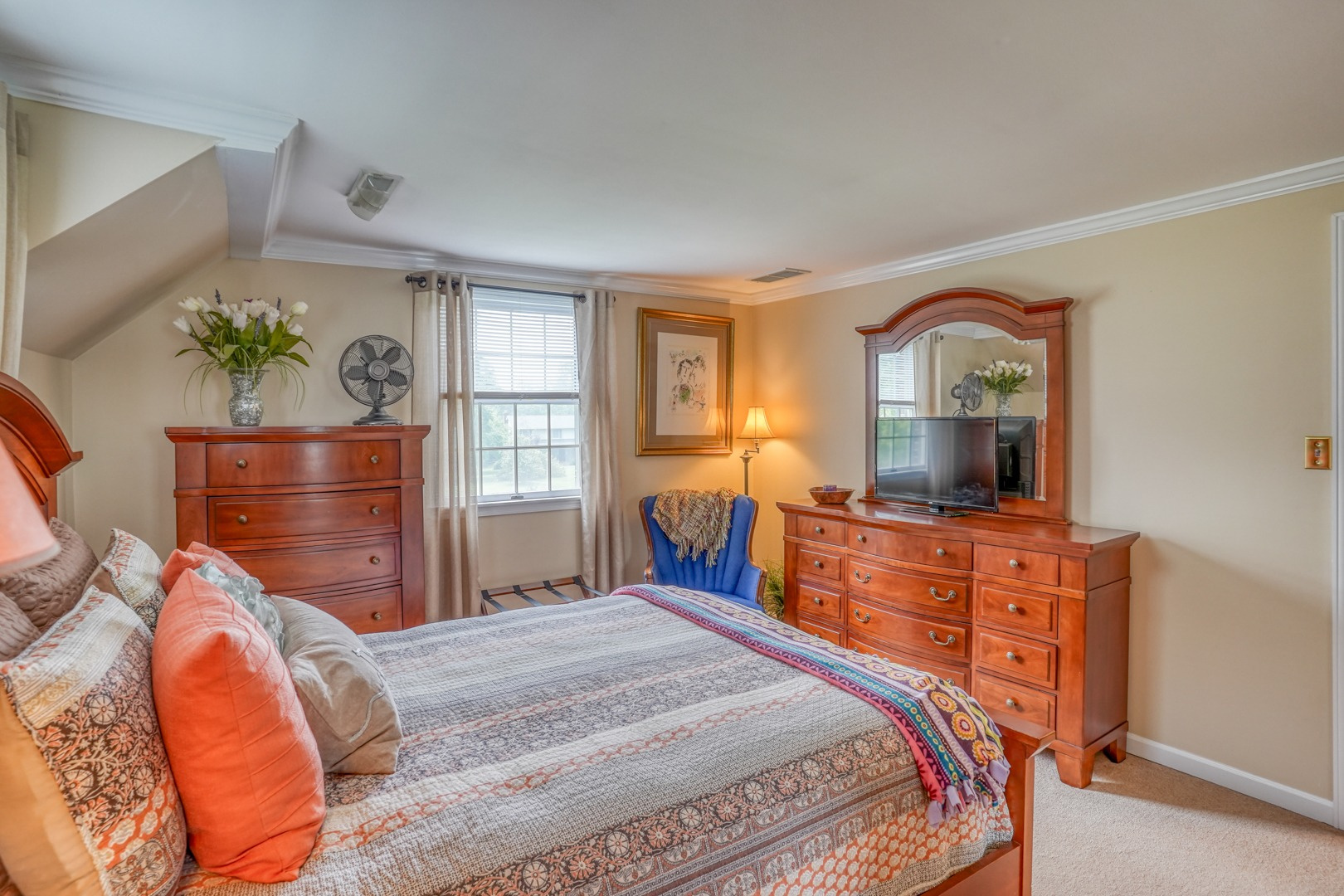 Step inside and be greeted by gleaming hardwood flooring that guides you through the main level. A traditional living room adjacent to the foyer can easily transform into a distinguished executive office with the addition of French doors. Connected to the living room, a formal dining room continues the theme of hardwood flooring, tasteful paint, and crown molding. The family room, kitchen, and sunroom present an ideal space for entertaining, featuring abundant windows that frame the picturesque views outside. Revel in the warmth of the brick wood-burning fireplace, complete with built-in wood storage, in the family room. This room also boasts wide plank flooring, a bay window overlooking the front porch, a slider to the rear deck, access to the attached garage, and ceiling fans to enhance comfort.