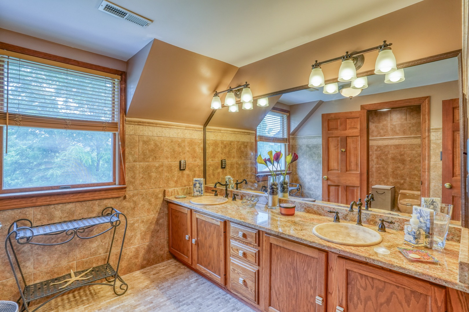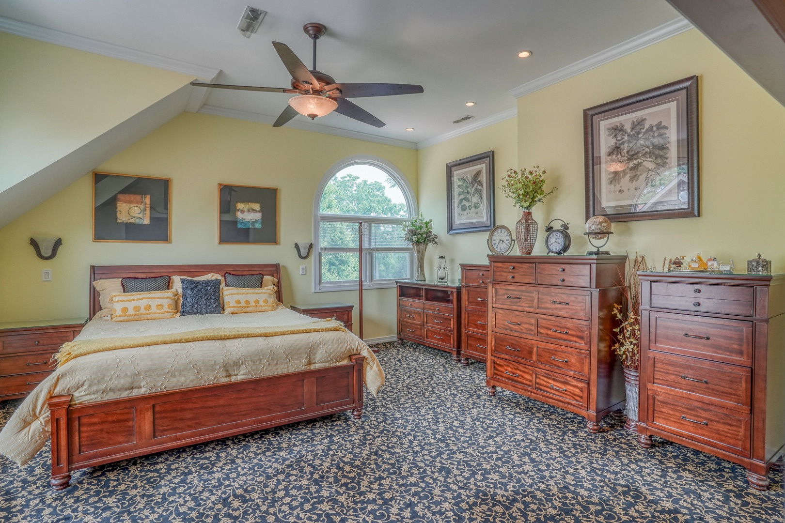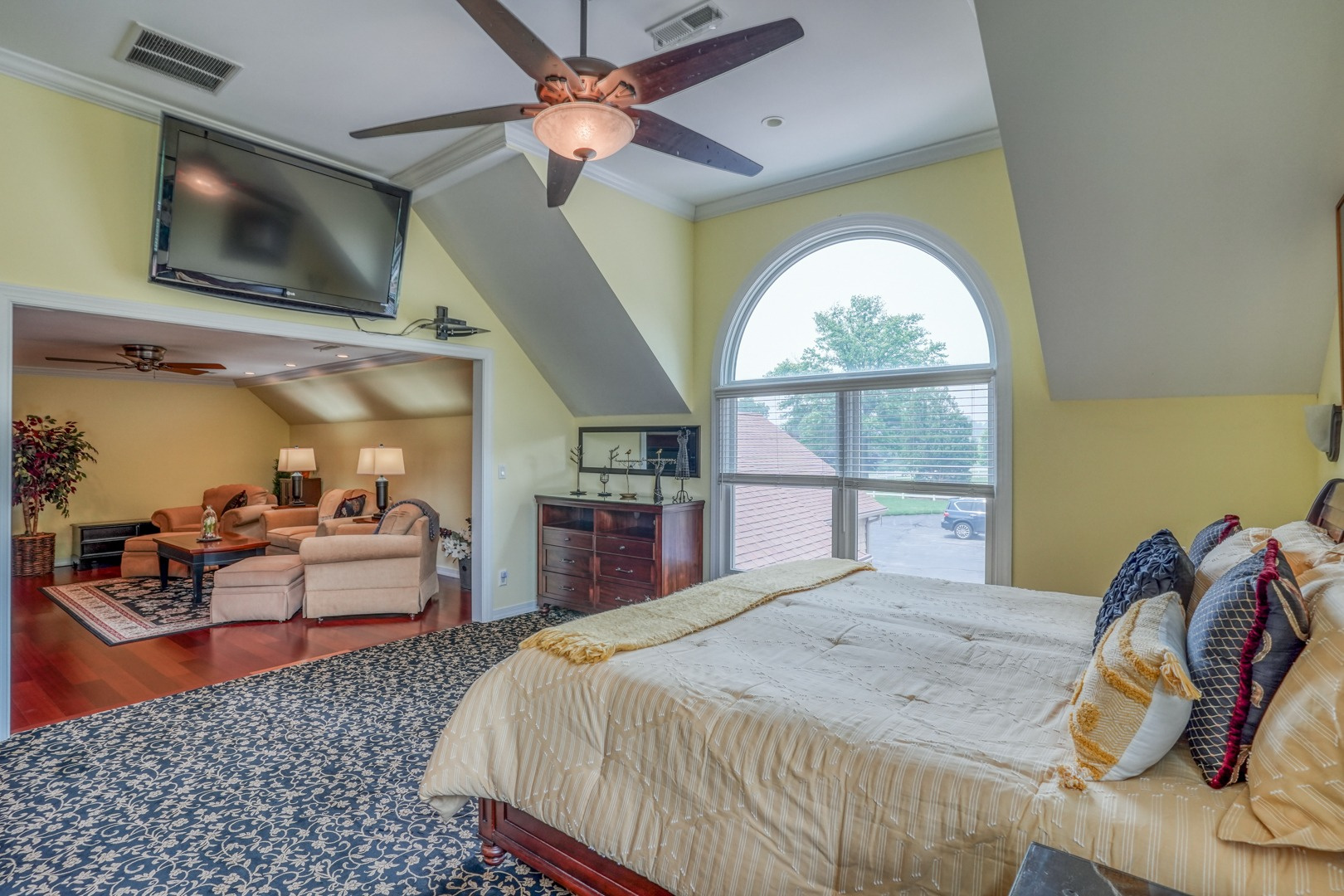 Ascend to the second floor, where an expanded master suite awaits. Spanning an impressive 20' x 17', the suite’s sitting room is large! The additional bed space has 10" ceilings, adorned with large double windows and arched accent windows. The master bathroom features a generous walk-in closet, a large tiled shower with a body spray system, laundry space, a jetted soaking tub, and double sinks. Three additional bedrooms on this level share a well-appointed bathroom, which offers separate shower and tub spaces for added privacy, along with a spacious double sink area. The fourth bedroom's closet provides access to the third-floor attic, which has been floored and offers the potential for additional living space.