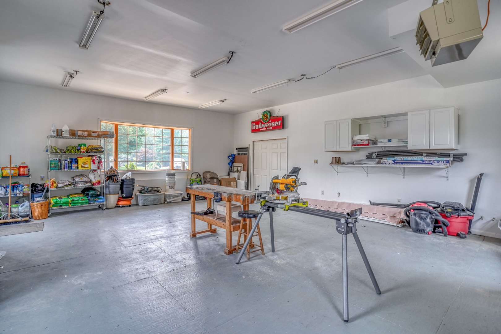 Prepare to be impressed by the detached two-car garage, which also includes an expansive workshop. With 8'7" doors, 10' ceilings, and garage door openers, the garage space is perfect for car enthusiasts. The workshop boasts a large bay window, additional windows for ample light and ventilation, storage wall cabinets, a garage space heater, and abundant outlets to accommodate all your woodworking or mechanic needs.